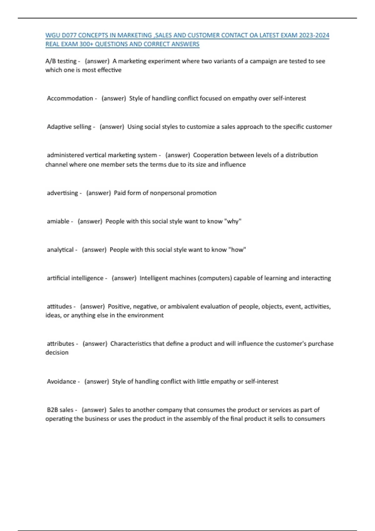 , WGU D077 CONCEPTS IN MARKETING ,SALES AND CUSTOMER CONTACT OA LATEST EXAM 2023-2024