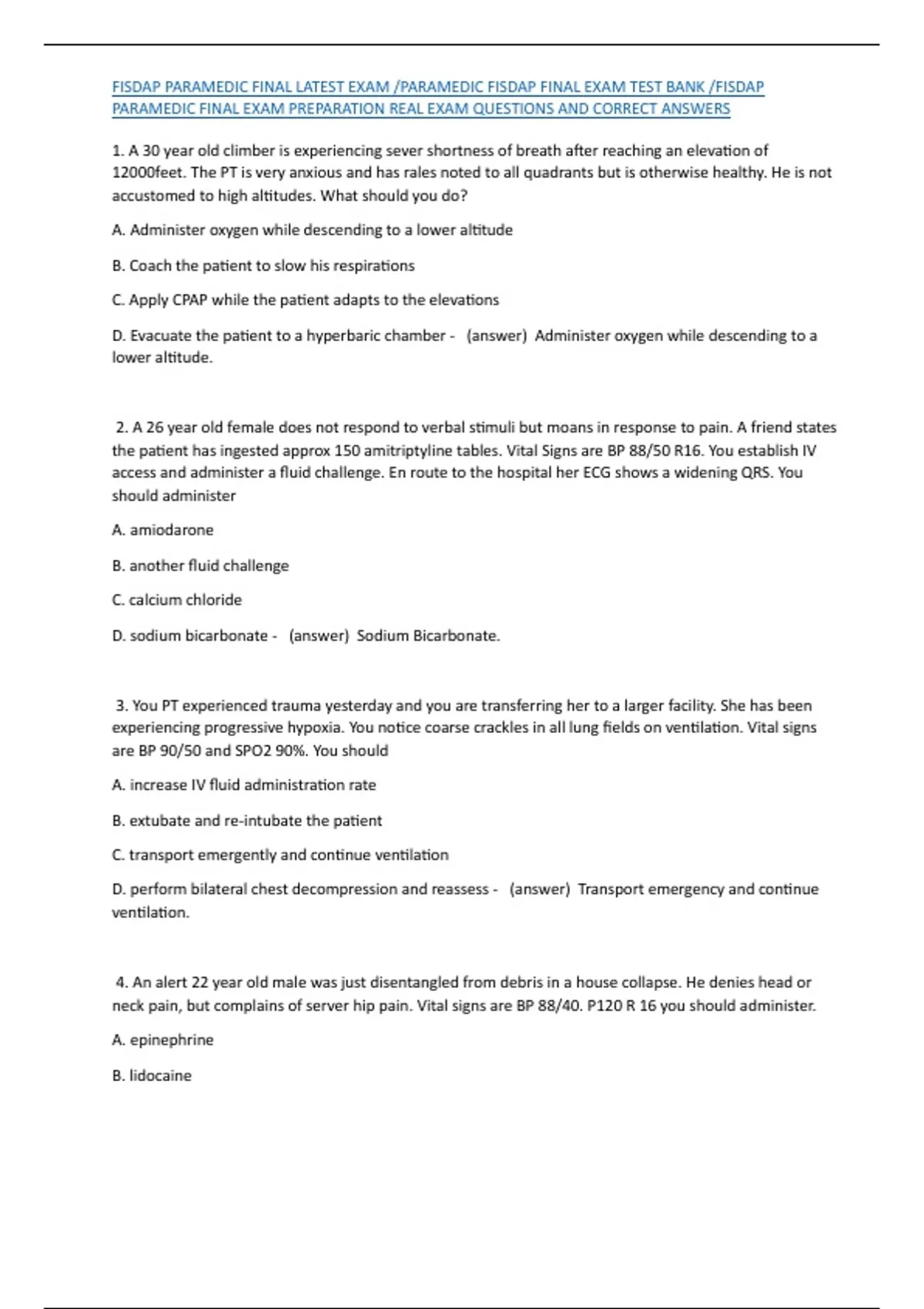 , FISDAP PARAMEDIC FINAL LATEST EXAM /PARAMEDIC FISDAP FINAL EXAM TEST BANK /FISDAP