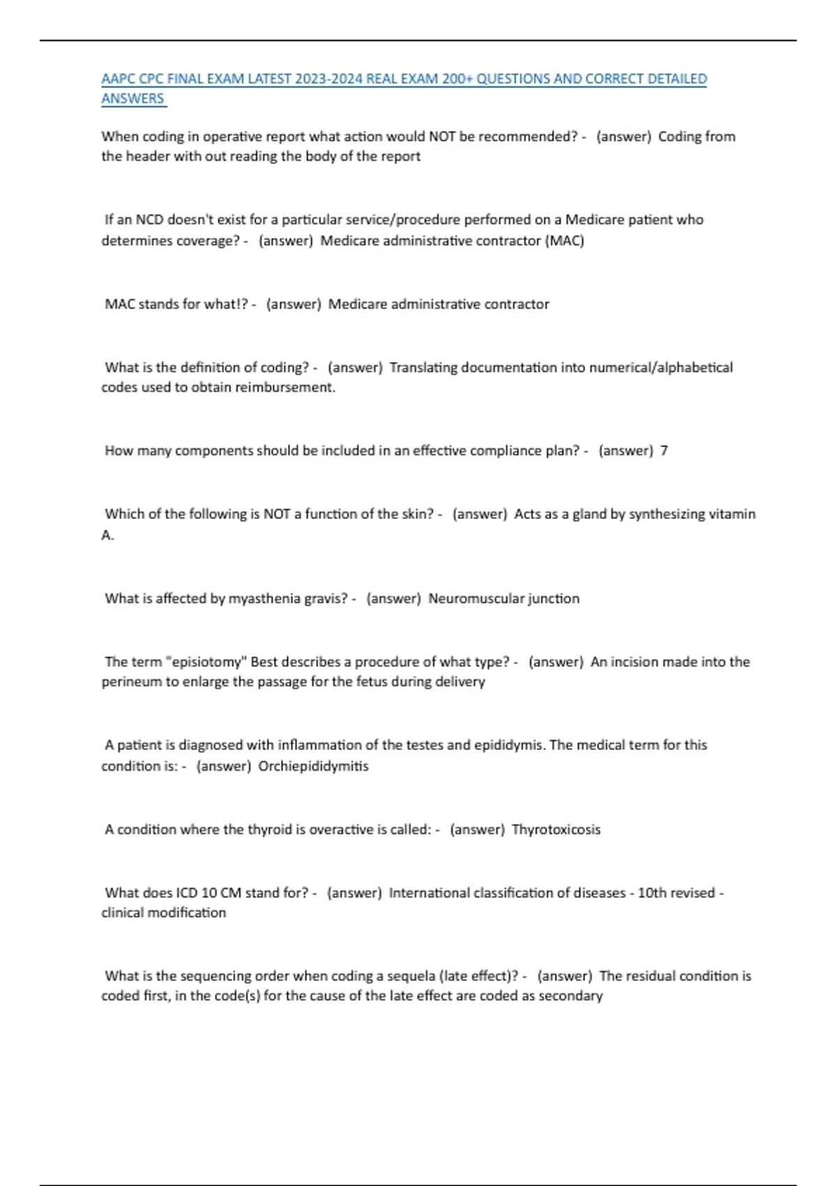 , AAPC CPC FINAL EXAM LATEST 2023-2024 REAL EXAM 200+ QUESTIONS AND CORRECT DETAILED