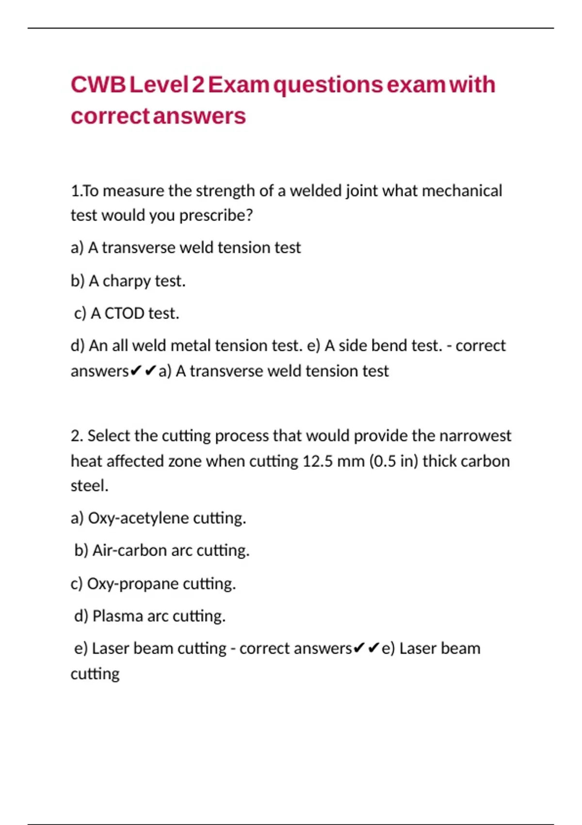 CWB Level 2 Exam questions exam with correct answers