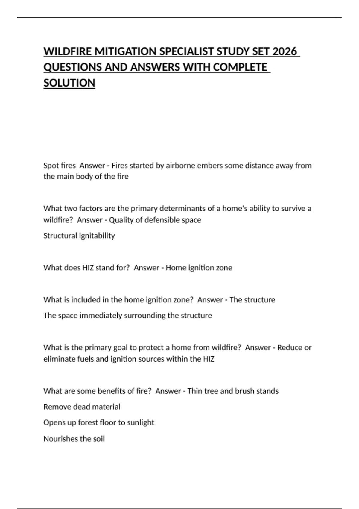 WILDFIRE MITIGATION SPECIALIST STUDY SET 2026 QUESTIONS AND ANSWERS WITH COMPLETE SOLUTION