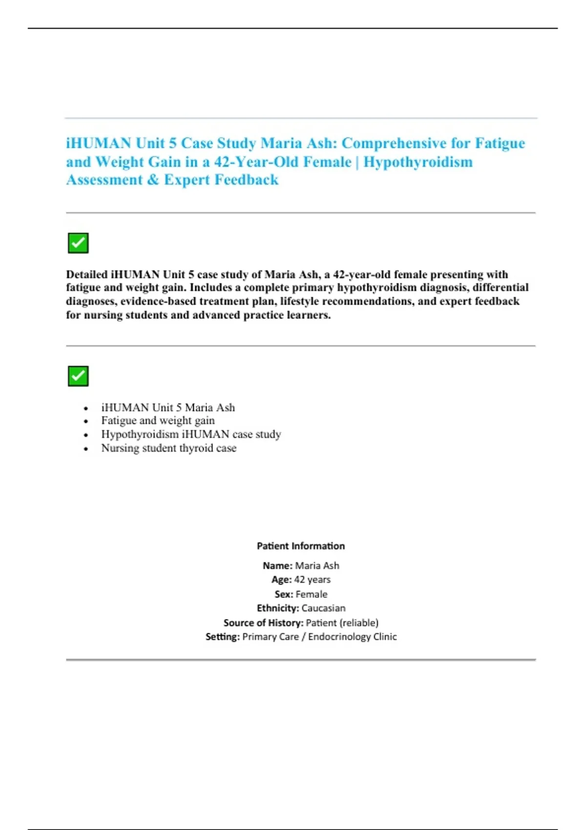 iHUMAN Unit 5 Case Study Maria Ash: Comprehensive for Fatigue and Weight Gain in a 42-Year-Old Female | Hypothyroidism Assessment & Expert Feedback