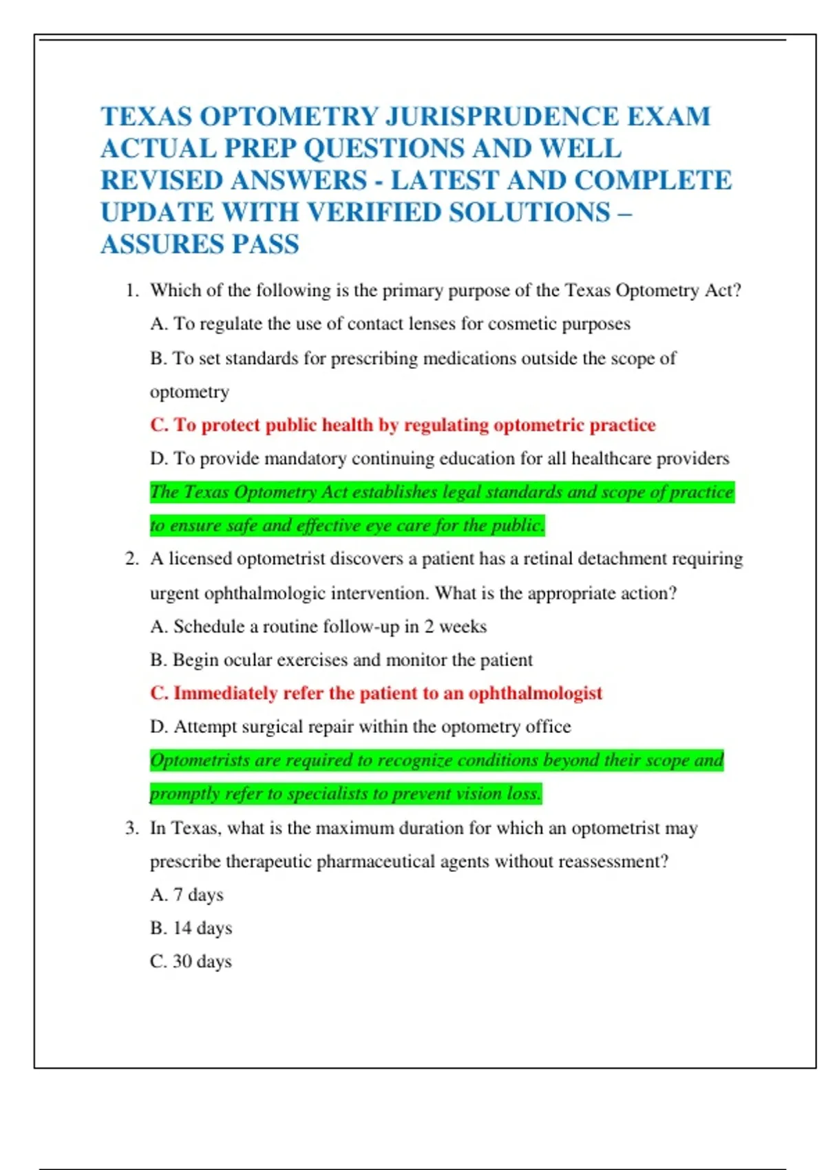 1. Which of the following is the primary purpose of the Texas Optometry Act?