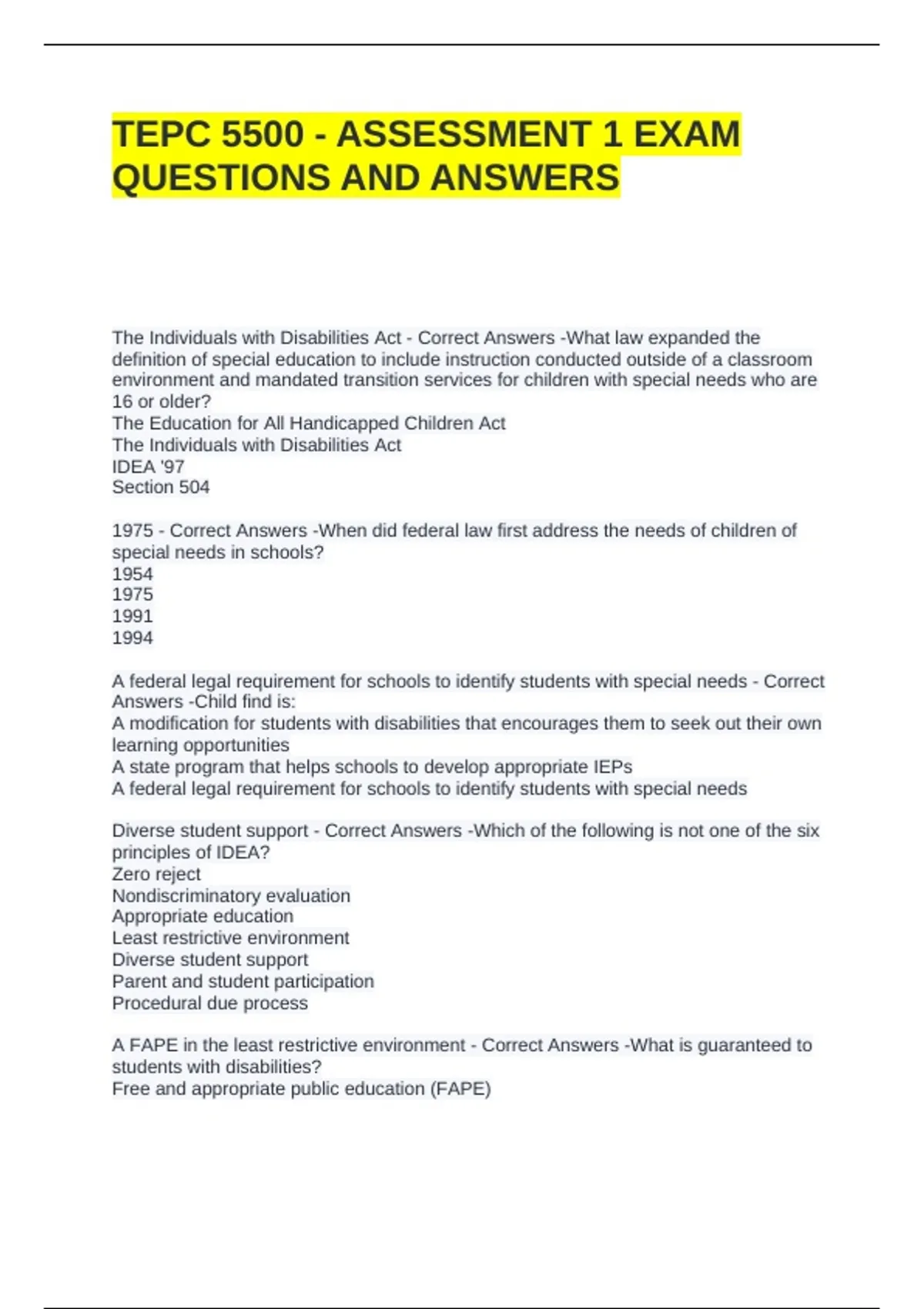 A FAPE in the least restrictive environment - Correct Answers -What is guaranteed to