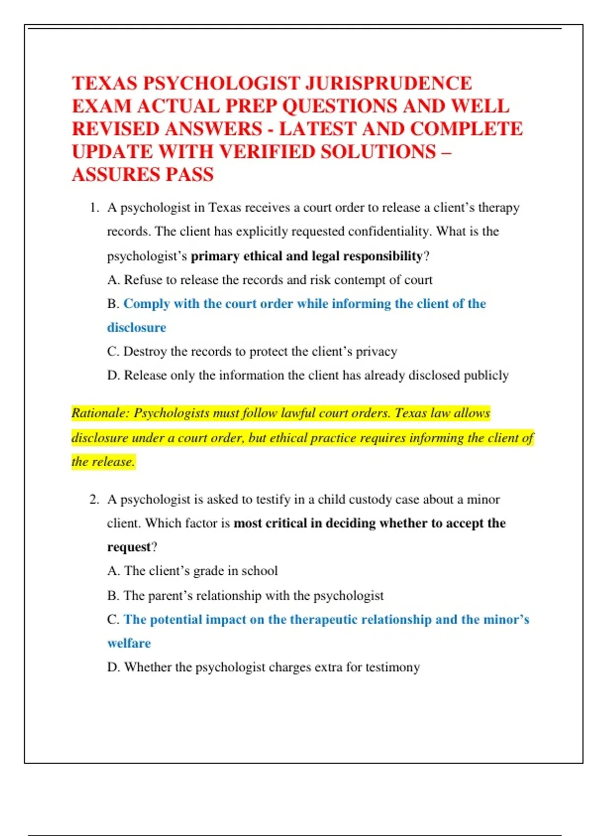 TEXAS PSYCHOLOGIST JURISPRUDENCE EXAM ACTUAL PREP QUESTIONS AND WELL REVISED ANSWERS - LATEST AND COMPLETE UPDATE WITH VERIFIED SOLUTIONS – ASSURES PASS
