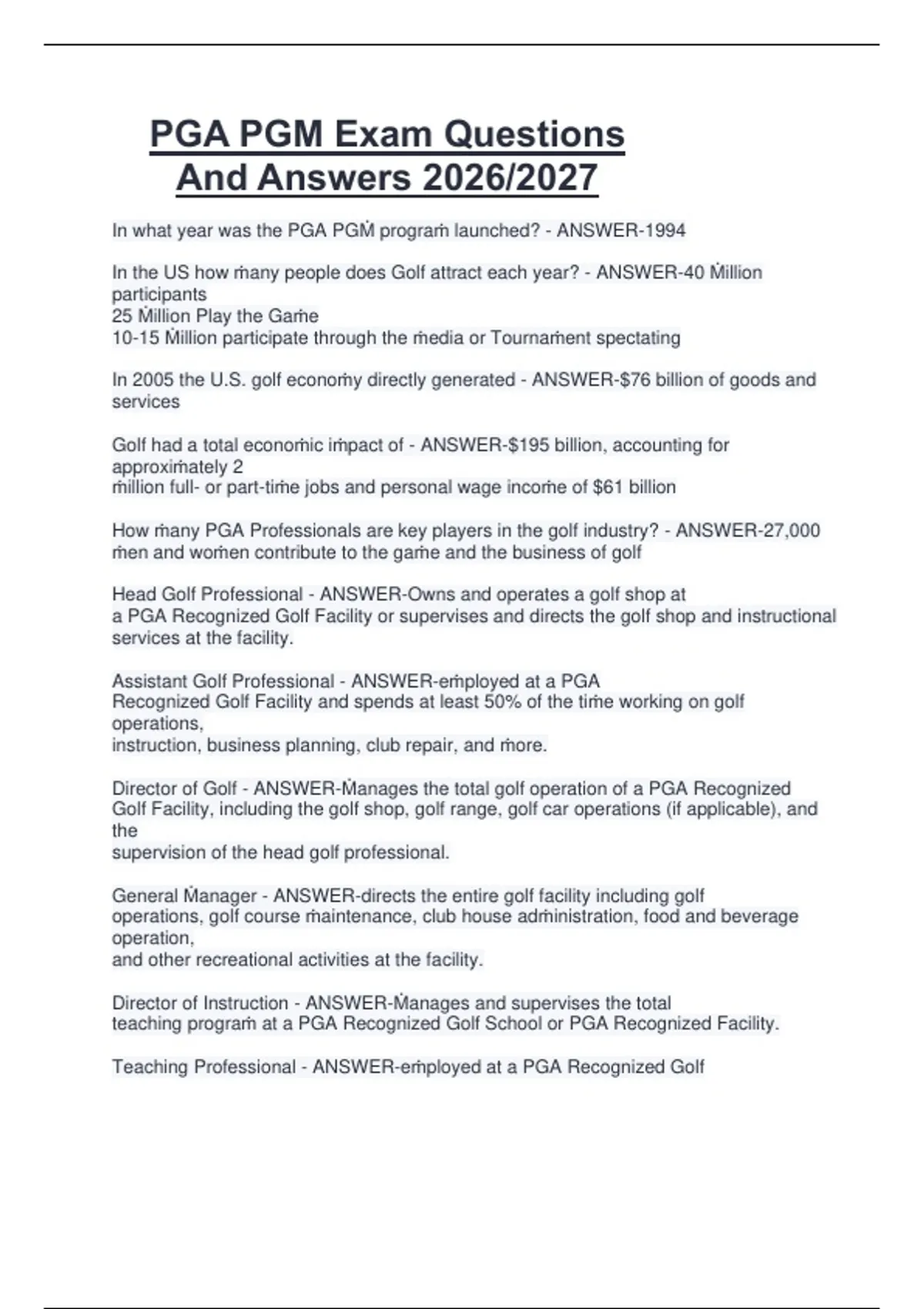 Intro to PGA PGṀ Prograṁ - ANSWER-This course describes the career opportunities,