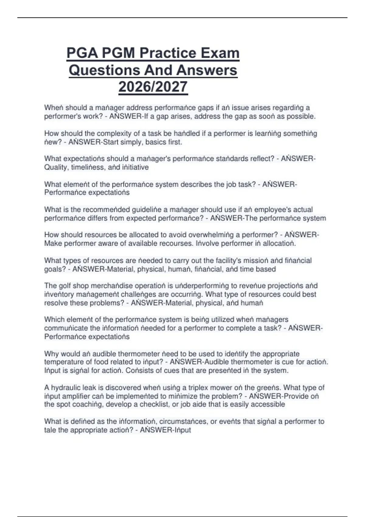 This document features practice exam questions and answers for the PGA Professional Golf Management (PGM) program. It covers major exam topics including golf operations, rules of golf, teaching and coaching concepts, tournament operations, merchandising, and golf business fundamentals for the 2026/2027 exam cycle. The practice-focused format helps reinforce knowledge and improve exam readiness.