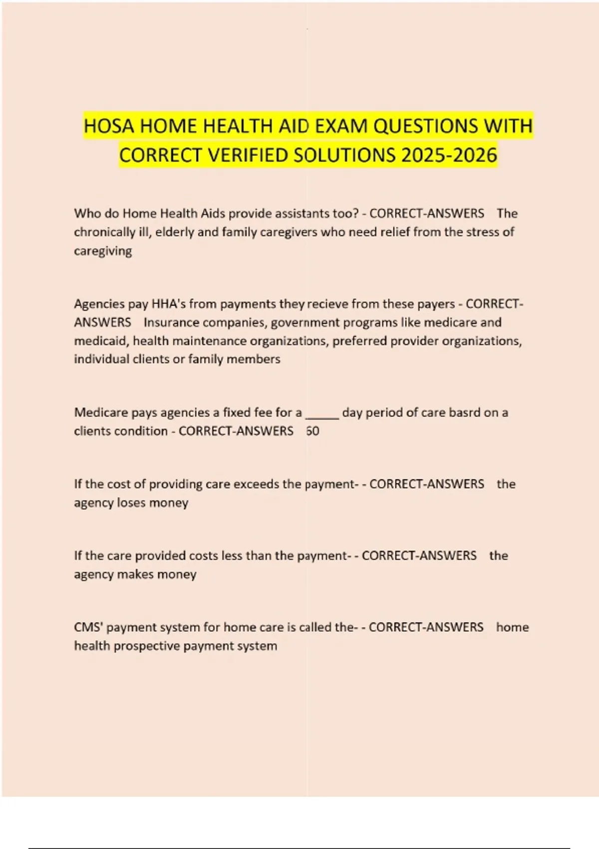 HOSA HOME HEALTH AID EXAM QUESTIONS WITH CORRECT VERIFIED SOLUTIONS