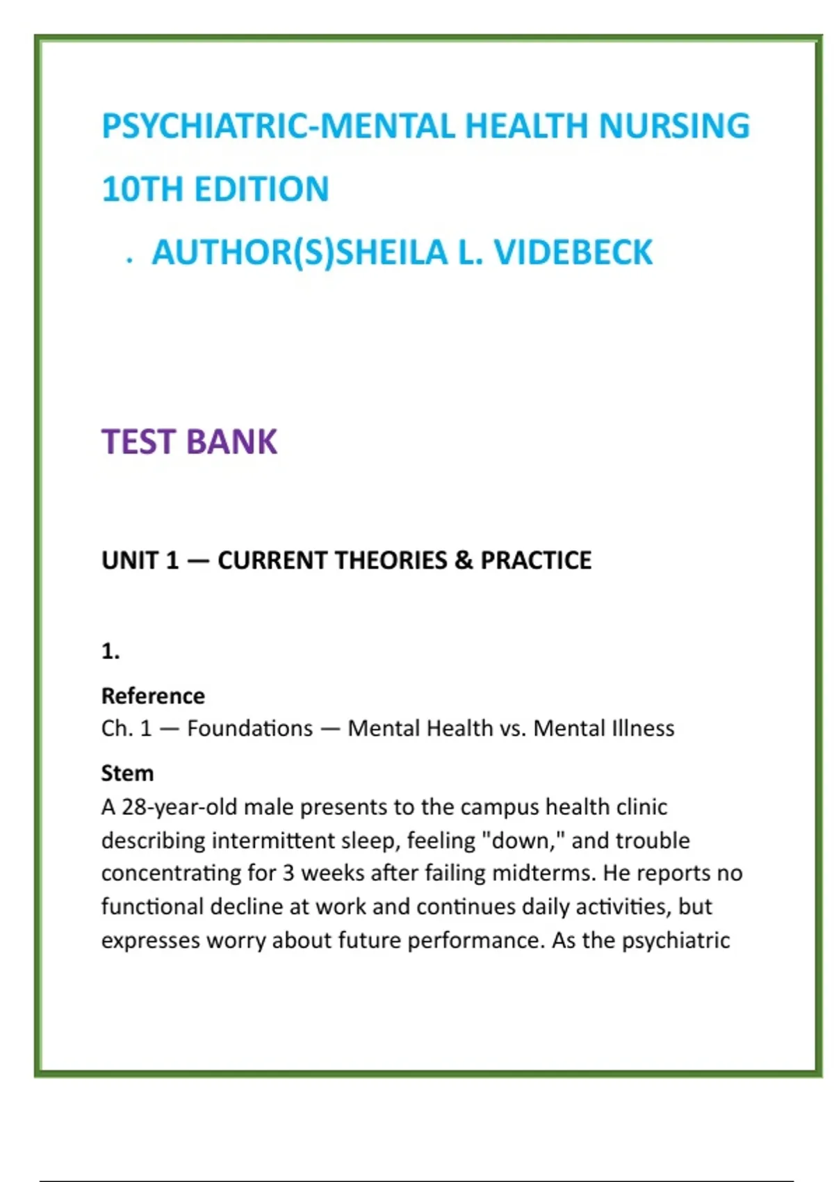 Psychiatric–Mental Health Nursing Test Bank | Videbeck 10th Ed | NCLEX-Style Psych Nursing MCQs & Therapeutic Communication 2) SEO Product Description (200–300 words) Master psychiatric–mental health nursing with confidence using this comprehensive test bank for Psychiatric–Mental Health Nursing, 10th Edition by Sheila L. Videbeck—one of the most trusted and widely adopted textbooks in mental health nursing education worldwide. This exam-focused digital test bank provides full textbook coverage of every unit and chapter, with 20 high-quality NCLEX-style multiple-choice questions (MCQs) per chapter. Each item is written at the application, analysis, and clinical judgment level, mirroring the complexity of real nursing exams and the NCLEX-RN®. Every question includes clear correct answers and detailed, evidence-based rationales, reinforcing core concepts while strengthening prioritization, safety awareness, and ethical decision-making. Scenarios emphasize therapeutic communication, nurse–patient relationships, mental health assessment, psychopharmacology, and crisis intervention, ensuring learners can translate theory into safe clinical practice. This test bank is ideal for students and educators seeking a time-saving, high-yield mental health nursing study guide that builds true understanding—not memorization. Content aligns with contemporary psychiatric nursing standards and supports success in psychiatric–mental health nursing courses, behavioral health modules, clinical rotations, and NCLEX psychiatric preparation. What’s Included: Full chapter-by-chapter coverage of Videbeck’s Psychiatric–Mental Health Nursing (10th Edition) 20 NCLEX-style psych nursing MCQs per chapter In-depth rationales for correct and incorrect options Clinical judgment, safety, and therapeutic communication focus Digital format for flexible, on-demand study Designed for nursing students who want clarity, confidence, and exam readiness in psychiatric–mental health nursing. 3) 8 High-Value SEO Keywords psychiatric mental health nursing test bank Videbeck psychiatric nursing 10th edition psych nursing MCQs mental health nursing study guide NCLEX psychiatric nursing questions therapeutic communication nursing questions behavioral health nursing test bank psychiatric nursing exam preparation 4) 10 Hashtags #PsychiatricNursing #MentalHealthNursing #PsychNursingTestBank #VidebeckNursing #NCLEXPsych #TherapeuticCommunication #BehavioralHealthNursing #NursingSchoolResources #NCLEXPrep #MentalHealthRN