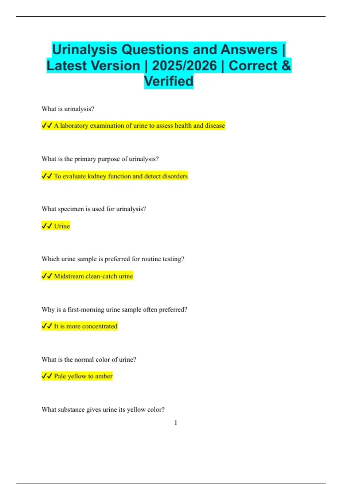 Urinalysis Questions and Answers | Latest Version | 2025/2026 | Correct & Verified What is urinalysis? A laboratory examination of urine to assess health and disease What is the primary purpose of urinalysis? To evaluate kidney function and detect disorders What specimen is used for urinalysis? Urine Which urine sample is preferred for routine testing? Midstream clean-catch urine Why is a first-morning urine sample often preferred? It is more concentrated What is the normal color of urine? Pale yellow to amber What substance gives urine its yellow color? 2 Urochrome What does cloudy urine often indicate? Presence of cells, bacteria, or crystals What is the normal urine odor? Slightly aromatic What abnormal odor may suggest infection? Foul or ammonia-like odor What is the normal pH range of urine? Approximately 4.5 to 8.0 What does acidic urine indicate? High protein intake or metabolic acidosis What does alkaline urine suggest? Urinary tract infection or vegetarian diet What is specific gravity used to measure? Urine concentration 3 What is the normal range of urine specific gravity? 1.005 to 1.030 What does low specific gravity indicate? Dilute urine or impaired kidney function What does high specific gravity indicate? Concentrated urine or dehydration What is proteinuria? Presence of protein in urine Which condition commonly causes proteinuria? Kidney disease What does glucose in urine indicate? Diabetes mellitus What term describes glucose in urine? Glycosuria 4 What does ketones in urine indicate? Fat metabolism or uncontrolled diabetes What is hematuria? Presence of blood in urine What does microscopic hematuria mean? Blood detected only under a microscope What does gross hematuria mean? Visible blood in urine What causes red urine besides blood? Certain foods or medications