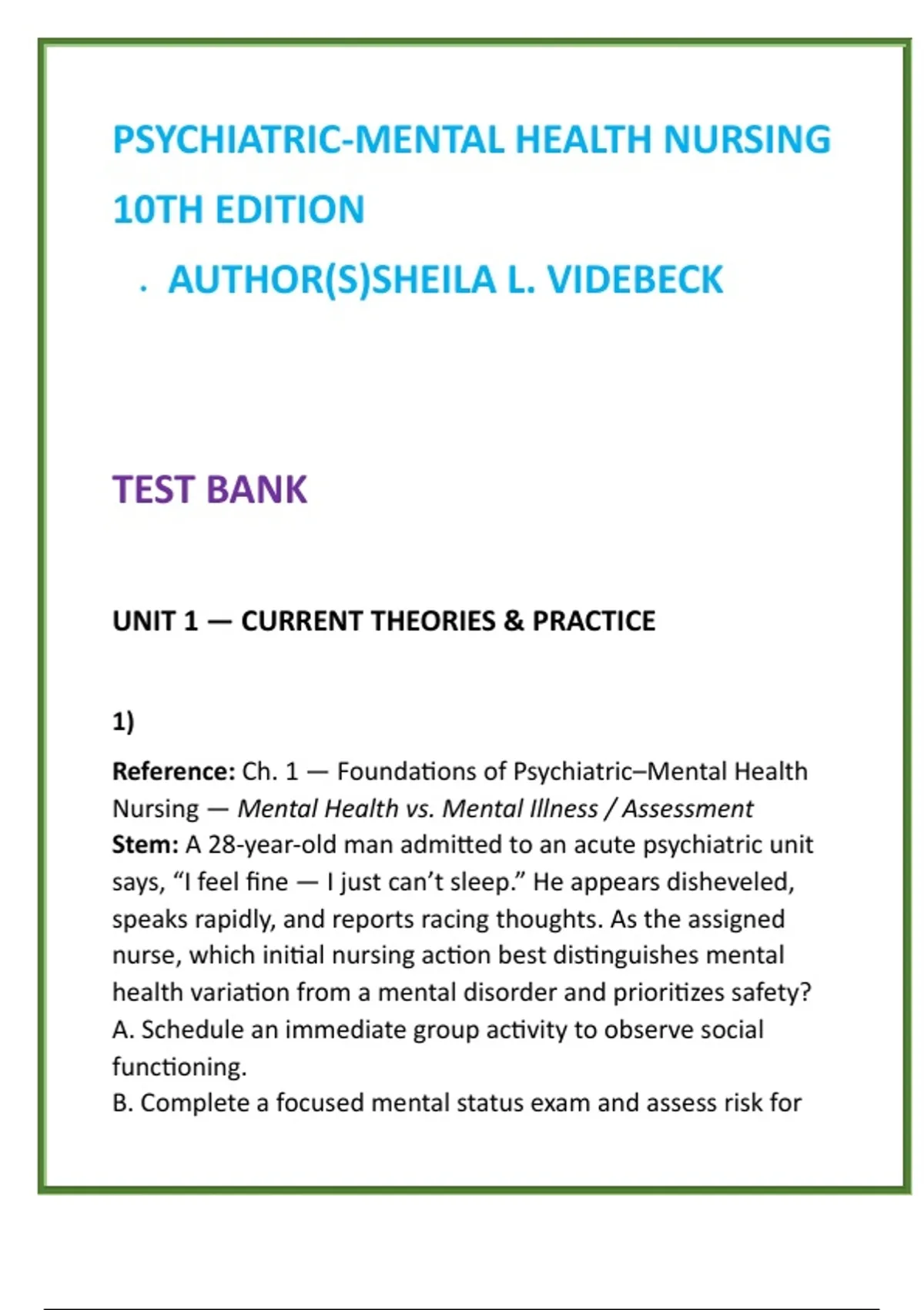 Psychiatric–Mental Health Nursing Test Bank | Videbeck 10th Edition | NCLEX-Style Psych Nursing MCQs & Therapeutic Communication 2) SEO Product Description (200–300 words) Master psychiatric–mental health nursing with confidence using this comprehensive digital test bank designed to fully align with Psychiatric–Mental Health Nursing, 10th Edition by Sheila L. Videbeck—one of the most trusted and widely adopted textbooks in mental health nursing education worldwide. This test bank provides FULL textbook coverage of all units and chapters, with 20 rigorously developed NCLEX-style multiple-choice questions per chapter, each paired with clear, evidence-based rationales. Questions are written at the application, analysis, and clinical judgment levels, reinforcing therapeutic communication, patient safety, ethical practice, and real-world psychiatric nursing decision-making. Every item reflects the realities of psychiatric–mental health nursing practice, including mental health assessment, nurse–patient relationships, psychopharmacology, crisis intervention, legal–ethical issues, and priority safety concerns. The content is ideal for strengthening clinical reasoning, improving exam performance, and building confidence for both classroom testing and NCLEX-RN® psychiatric nursing preparation. What’s Included: FULL coverage of all chapters from Videbeck’s Psychiatric–Mental Health Nursing (10th Edition) 20 NCLEX-style MCQs per chapter Correct answers with detailed rationales for every question Clinical judgment–focused scenarios emphasizing: Therapeutic communication Mental health and psychosocial assessment Anxiety, mood, psychotic, personality, substance-related, and cognitive disorders Crisis intervention, safety, and ethical/legal nursing responsibilities Ideal For: Psychiatric–Mental Health Nursing (PMHN) Behavioral Health Nursing courses Mental Health & Psychosocial Nursing Clinical mental health rotations NCLEX-RN® psychiatric nursing exam preparation This test bank is a time-saving, exam-focused study tool designed to help nursing students succeed academically and clinically in psychiatric–mental health nursing. 3) 8 High-Value SEO Keywords psychiatric mental health nursing test bank Videbeck psychiatric nursing 10th edition psych nursing MCQs mental health nursing study guide NCLEX psychiatric nursing questions therapeutic communication nursing questions behavioral health nursing test bank psychiatric nursing exam preparation 4) 10 SEO-Optimized Hashtags #PsychiatricNursing #MentalHealthNursing #VidebeckTestBank #PsychNursingMCQs #NCLEXPsychPrep #TherapeuticCommunication #BehavioralHealthNursing #NursingExamPrep #NursingStudents #PsychiatricMentalHealth