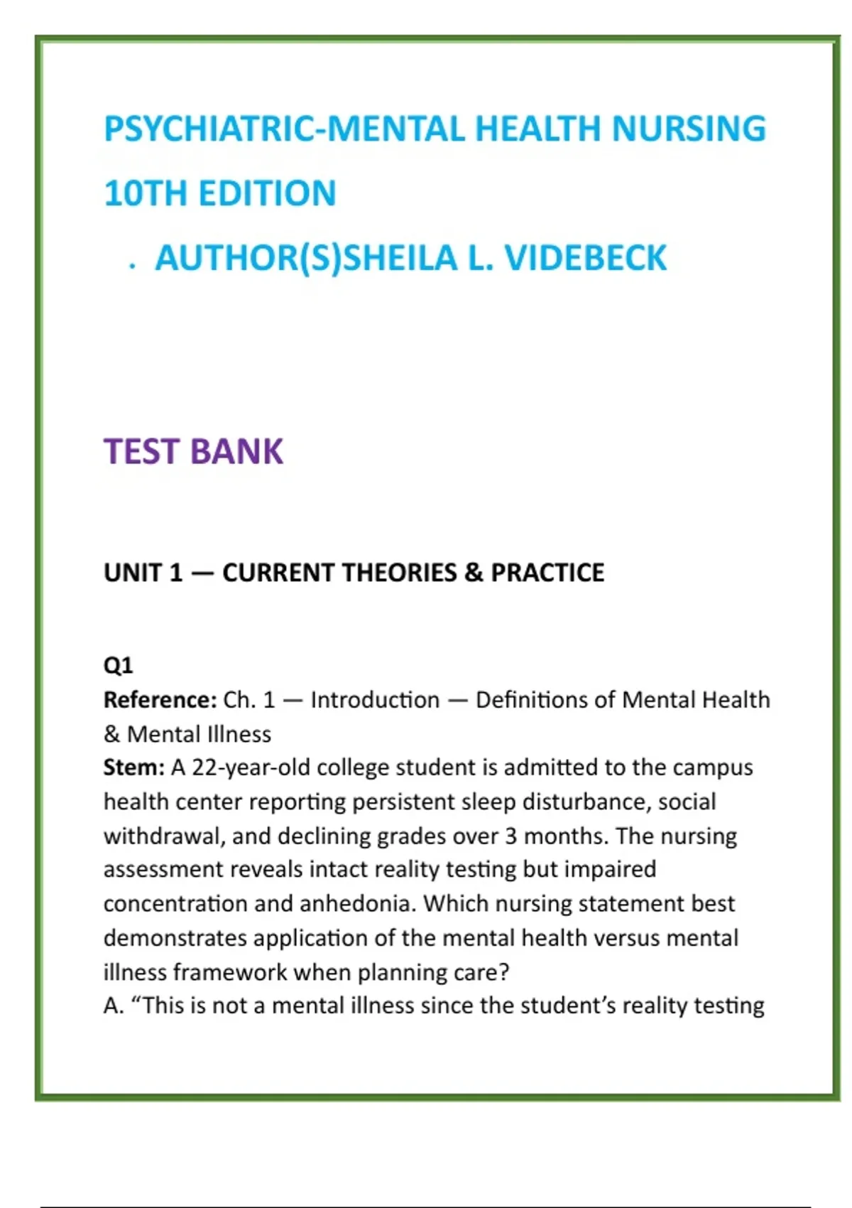 1) SEO Title (≤150 characters) Psychiatric–Mental Health Nursing Test Bank | Videbeck 10th Ed | NCLEX-Style Psych Nursing MCQs & Therapeutic Communication 2) SEO Product Description (200–300 words) Master psychiatric–mental health nursing with confidence using this comprehensive digital test bank designed to align precisely with Psychiatric–Mental Health Nursing, 10th Edition by Sheila L. Videbeck—one of the most trusted and widely adopted textbooks in mental health nursing education worldwide. This test bank provides FULL textbook coverage across ALL units and chapters, with 20 high-quality NCLEX-style multiple-choice questions (MCQs) per chapter, each accompanied by clear, evidence-based rationales. Questions are written at the application, analysis, and clinical judgment levels, emphasizing therapeutic communication, patient safety, ethical–legal decision-making, and psychiatric nursing priorities. Built for exam success and real-world clinical reasoning, this resource reinforces key concepts through realistic mental health scenarios involving assessment, nurse–patient relationships, psychopharmacology, crisis intervention, and management of common psychiatric disorders. Every item mirrors the style, rigor, and decision-making focus of NCLEX-RN® psychiatric nursing questions, making it ideal for both coursework and licensure preparation. Key Features: FULL coverage of Videbeck’s Psychiatric–Mental Health Nursing (10th Edition) 20 NCLEX-style MCQs per chapter with verified correct answers Detailed rationales explaining clinical judgment and nursing priorities Strong emphasis on therapeutic communication and safety Covers anxiety, mood, psychotic, personality, substance-related, and cognitive disorders Includes legal, ethical, and crisis intervention scenarios Instant digital access — study anytime, anywhere Ideal For: Psychiatric–Mental Health Nursing (PMHN) courses Behavioral Health & Psychosocial Nursing Clinical mental health rotations NCLEX-RN® psychiatric nursing preparation Develop sharper clinical reasoning, strengthen therapeutic communication skills, and approach psychiatric nursing exams with confidence using this exam-focused, concept-driven test bank authored in alignment with Sheila L. Videbeck’s authoritative framework. 3) 8 High-Value SEO Keywords psychiatric mental health nursing test bank Videbeck psychiatric nursing 10th edition psych nursing MCQs mental health nursing study guide NCLEX psychiatric nursing questions therapeutic communication nursing test bank behavioral health nursing exam questions psychiatric nursing NCLEX prep 4) 10 Hashtags #PsychiatricNursing #MentalHealthNursing #PsychNursingTestBank #VidebeckNursing #NCLEXPsych #TherapeuticCommunication #BehavioralHealthNursing #NursingExamPrep #PMHNNursing #NursingStudents