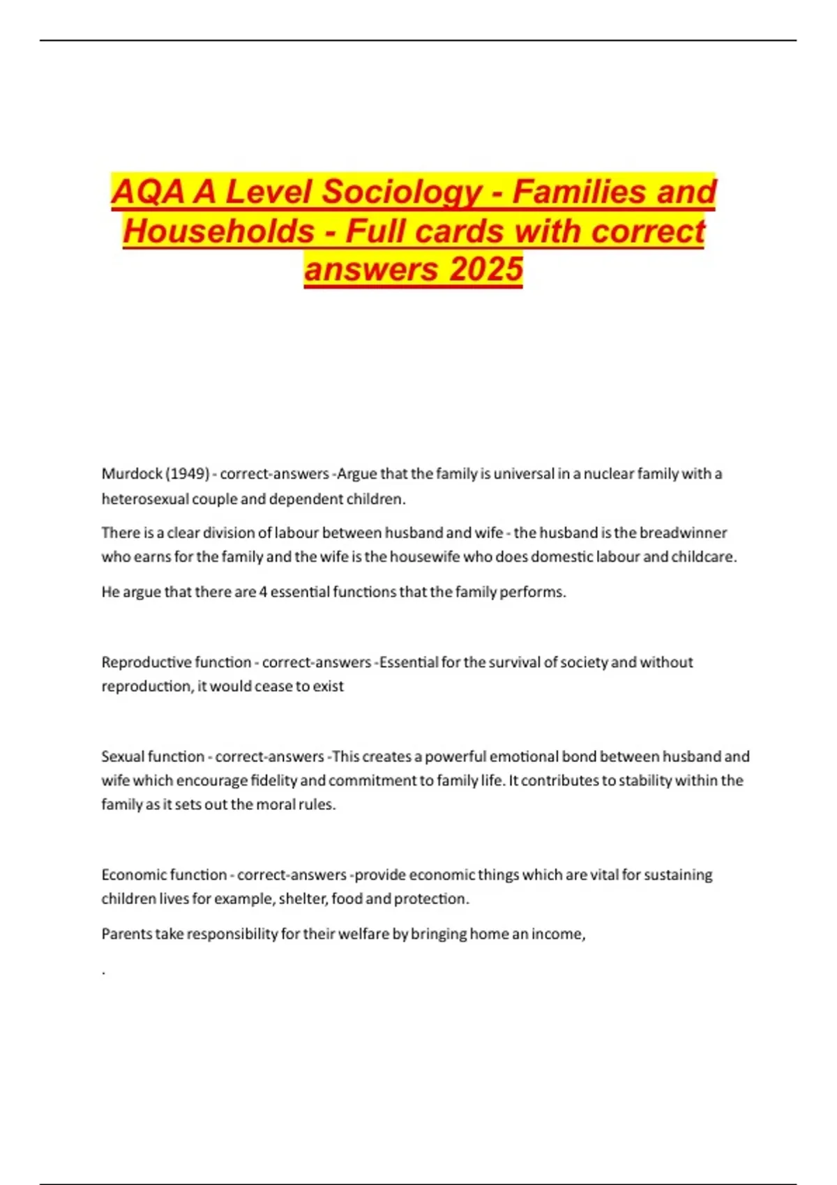 Comprehensive revision cards for AQA A-Level Sociology: Families & Households. Includes Murdock, Parsons, Feminist, Marxist & Postmodern perspectives, family diversity, demography, social policy, and more. Perfect for exam preparation, essay writing, and class notes. Updated for 2025 syllabus.