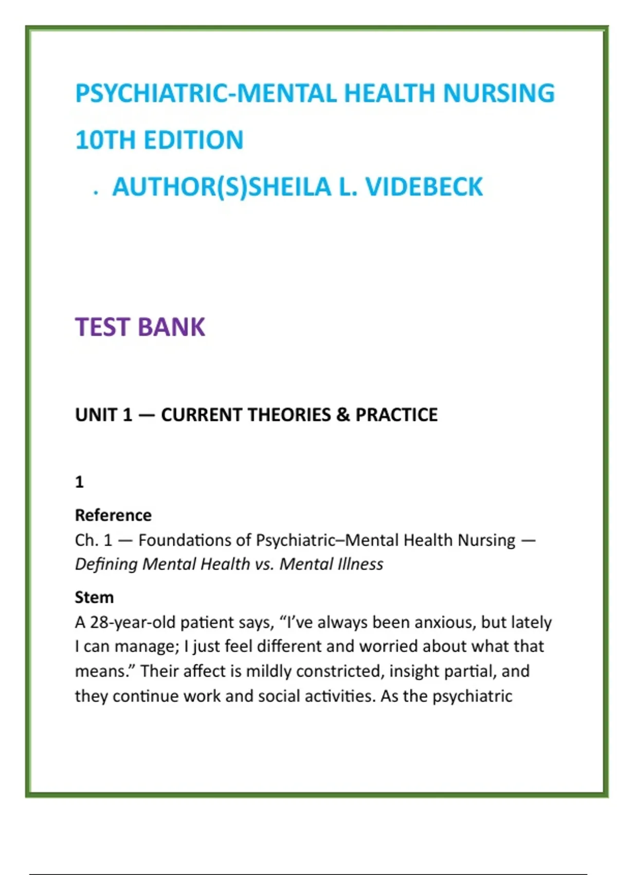 Psychiatric–Mental Health Nursing Test Bank | Videbeck 10th Ed | NCLEX-Style Psych Nursing MCQs & Therapeutic Communication 2) SEO Product Description (200–300 words) Master psychiatric–mental health nursing with confidence using this comprehensive Psychiatric–Mental Health Nursing Test Bank aligned with Sheila L. Videbeck’s globally trusted 10th Edition textbook. Designed specifically for BSN, ADN, and NCLEX-RN® candidates, this digital resource delivers full textbook coverage with 20 rigorously written NCLEX-style MCQs per chapter, ensuring complete preparation across all psychiatric nursing concepts. Each question is crafted to strengthen clinical judgment, therapeutic communication, and patient-centered mental health care, mirroring real-world psychiatric nursing scenarios. Detailed, evidence-based rationales explain not only why an answer is correct, but also why alternative options are unsafe, ineffective, or outside nursing scope—building deep understanding rather than memorization. This test bank emphasizes high-yield psychiatric content including mental health assessment, nurse–patient relationship boundaries, psychopharmacology, anxiety and mood disorders, psychotic and personality disorders, substance-related disorders, cognitive disorders, crisis intervention, safety, and legal–ethical responsibilities. Questions are written at application, analysis, and evaluation levels, making this resource ideal for both course exams and NCLEX-RN® psychiatric nursing preparation. Key Features Full coverage of Psychiatric–Mental Health Nursing, 10th Edition (all units & chapters) 20 NCLEX-style MCQs per chapter with in-depth rationales Strong focus on therapeutic communication and clinical judgment Exam-focused, time-saving digital format Ideal for PMHN courses, behavioral health nursing, and NCLEX psych prep Built on Videbeck’s evidence-based framework, this test bank is a trusted, exam-ready study tool for nursing students aiming to excel in psychiatric–mental health nursing. 3) 8 High-Value SEO Keywords psychiatric mental health nursing test bank Videbeck psychiatric nursing test bank psych nursing MCQs mental health nursing study guide NCLEX psychiatric nursing questions therapeutic communication nursing MCQs psychiatric nursing exam questions behavioral health nursing test bank 4) 10 Optimized Hashtags #PsychiatricNursing #MentalHealthNursing #PsychNursingTestBank #VidebeckPMHN #NCLEXPsych #TherapeuticCommunication #NursingSchoolSuccess #BehavioralHealthNursing #NCLEXRNPrep #NursingExamPrep