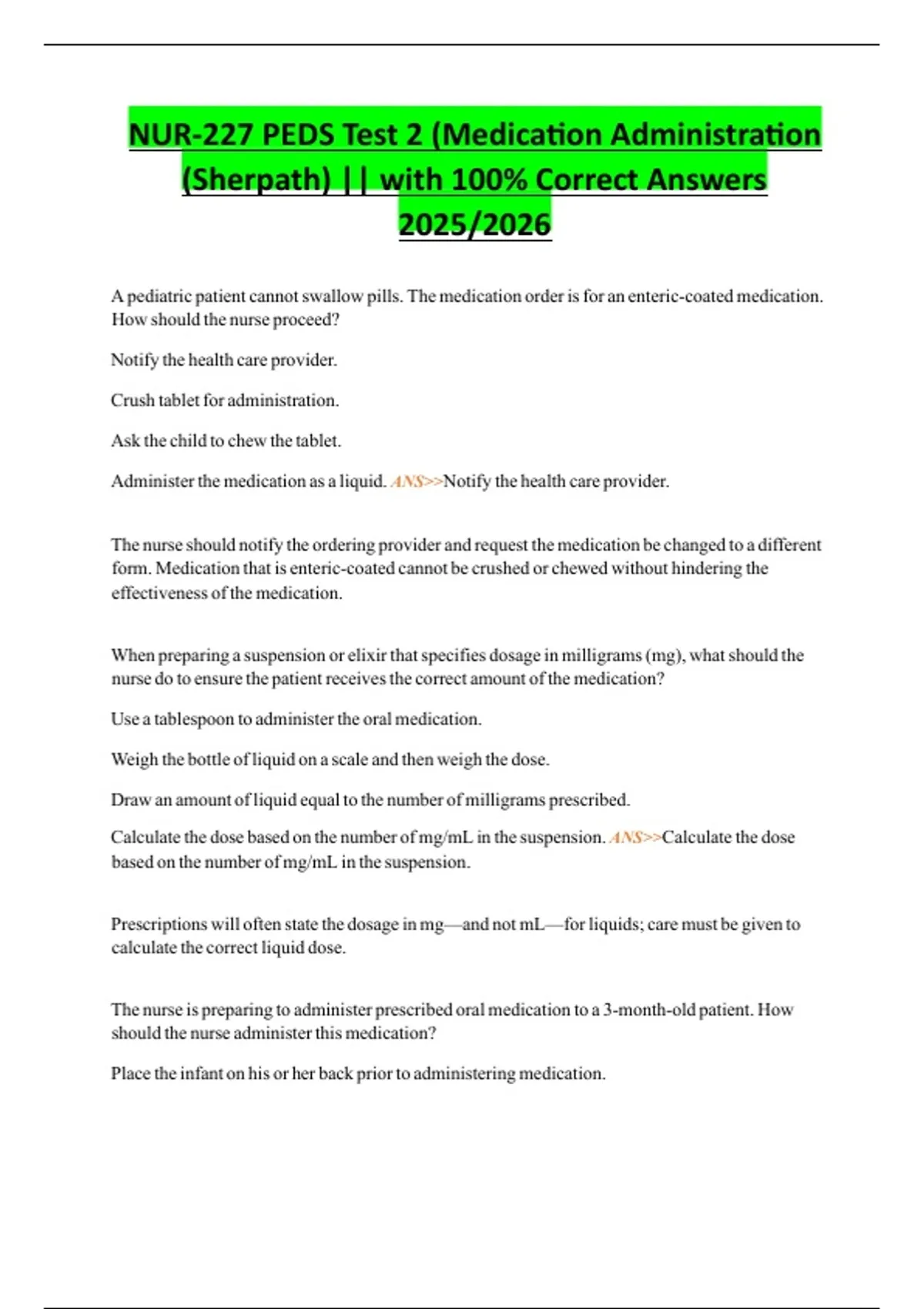 Master pediatric medication administration with this NUR-227 Exam 2 study guide. Includes verified answers on oral, IV, IM, and topical meds for infants & children, safe techniques, dosage calculations, and patient/family education. Essential for nursing students in pediatric clinicals.