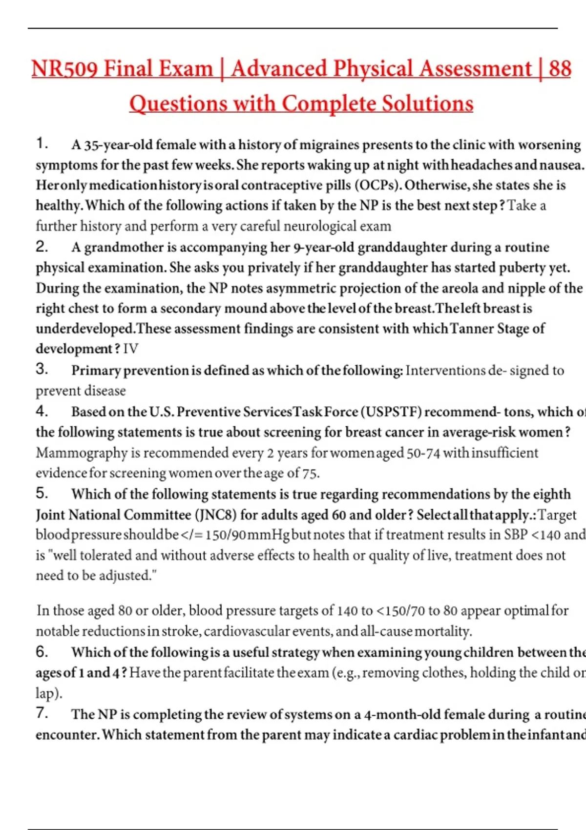 This document contains 88 comprehensive final exam questions with complete, detailed solutions for NR509: Advanced Physical Assessment. It covers key assessment topics including health history, diagnostic reasoning, system-specific examinations, differential diagnoses, and clinical decision-making aligned with NR509 course objectives.