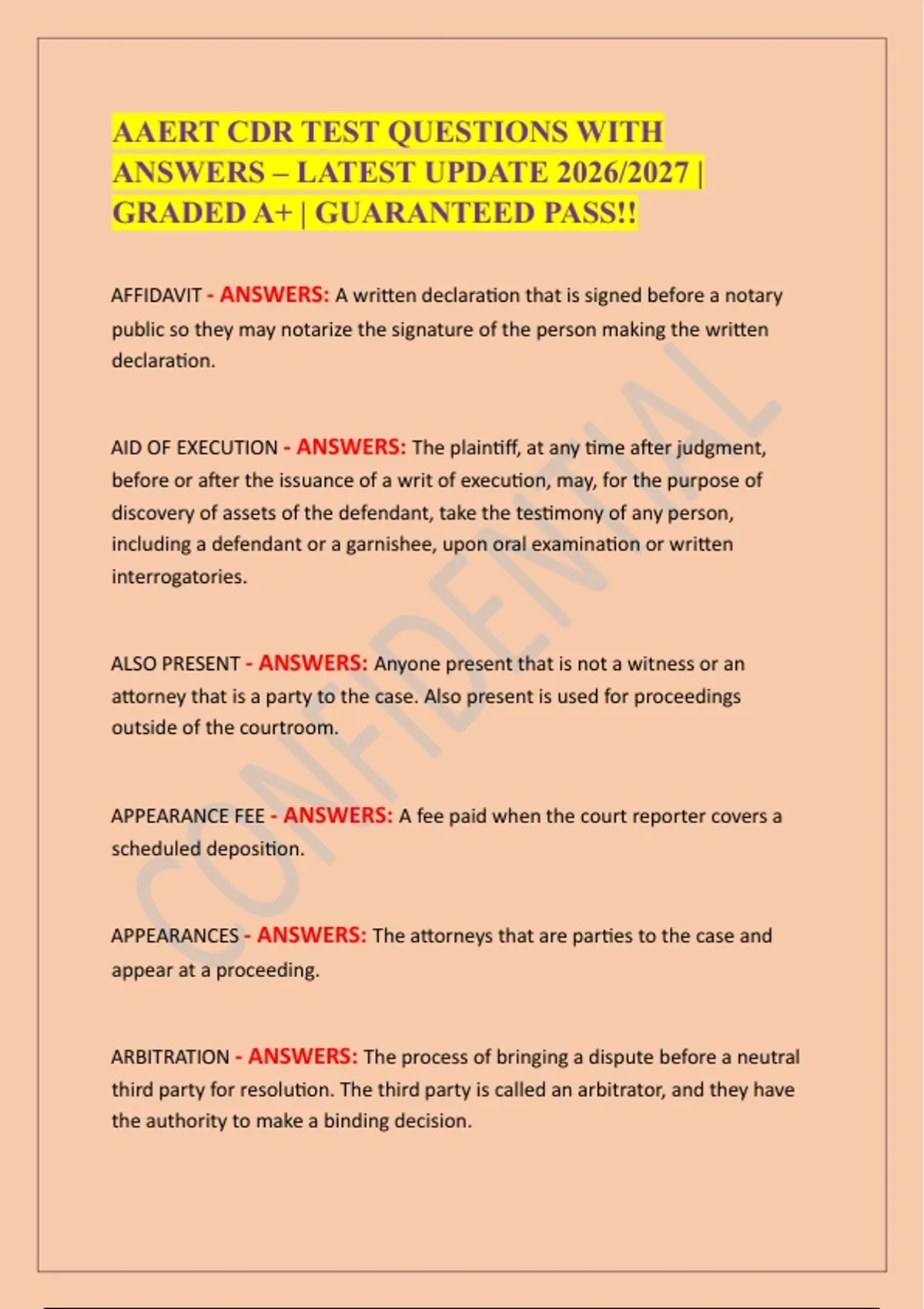 AAERT CDR TEST QUESTIONS WITH ANSWERS – LATEST UPDATE 2026/2027 | GRADED A+ | GUARANTEED PASS!! AFFIDAVIT - ANSWERS: A written declaration that is signed before a notary public so they may notarize the signature of the person making the written declaration. AID OF EXECUTION - ANSWERS: The plaintiff, at any time after judgment, before or after the issuance of a writ of execution, may, for the purpose of discovery of assets of the defendant, take the testimony of any person, including a defendant or a garnishee, upon oral examination or written interrogatories. ALSO PRESENT - ANSWERS: Anyone present that is not a witness or an attorney that is a party to the case. Also present is used for proceedings outside of the courtroom. APPEARANCE FEE - ANSWERS: A fee paid when the court reporter covers a scheduled deposition. APPEARANCES - ANSWERS: The attorneys that are parties to the case and appear at a proceeding. ARBITRATION - ANSWERS: The process of bringing a dispute before a neutral third party for resolution. The third party is called an arbitrator, and they have the authority to make a binding decision. ASCII - ANSWERS: A term in court reporting that is used to mean the .txt file type of the transcript or certificate page created by the reporter. BOOKMARK - ANSWERS: Another term for timestamp. BY LINE - ANSWERS: States the name of the person doing the questioning in legal transcripts. ANNOTATION - ANSWERS: Notes typed by the digital reporter while on the record. C.V. - ANSWERS: C.V. stands for curriculum vitae. It is typically in reference to a doctor's resume. CALENDAR - ANSWERS: A schedule of upcoming appearances in court or legal proceedings. CANCELATION FEE - ANSWERS: A fee paid when a job is canceled within the cancelation policy of the agency. CHANNEL - ANSWERS: A proceeding can be recorded with multiple channels of audio. CLAIM NUMBER - ANSWERS: When a claim is filed with an insurance company, a claim number is assigned. CLAIMANT - ANSWERS: A person who suffered a loss and is making a claim against an insurance company.