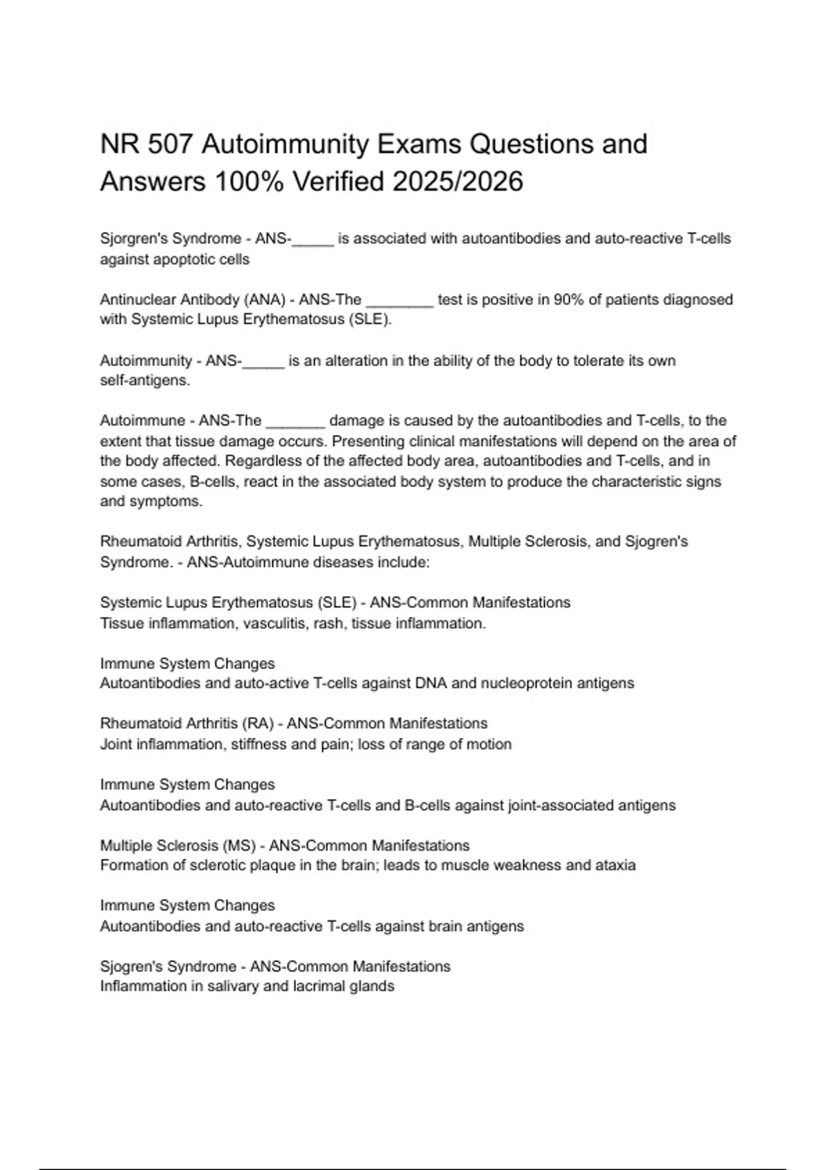 NR 507 Autoimmunity exams with this 100% verified questions and answers study guide. This resource provides detailed, exam-style questions with clear explanations with solution, designed to reinforce key immunology concepts, enhance understanding of autoimmune mechanisms, and boost test-taking confidence. Ideal for NR 507 students aiming to excel in 2025/2026 assessments