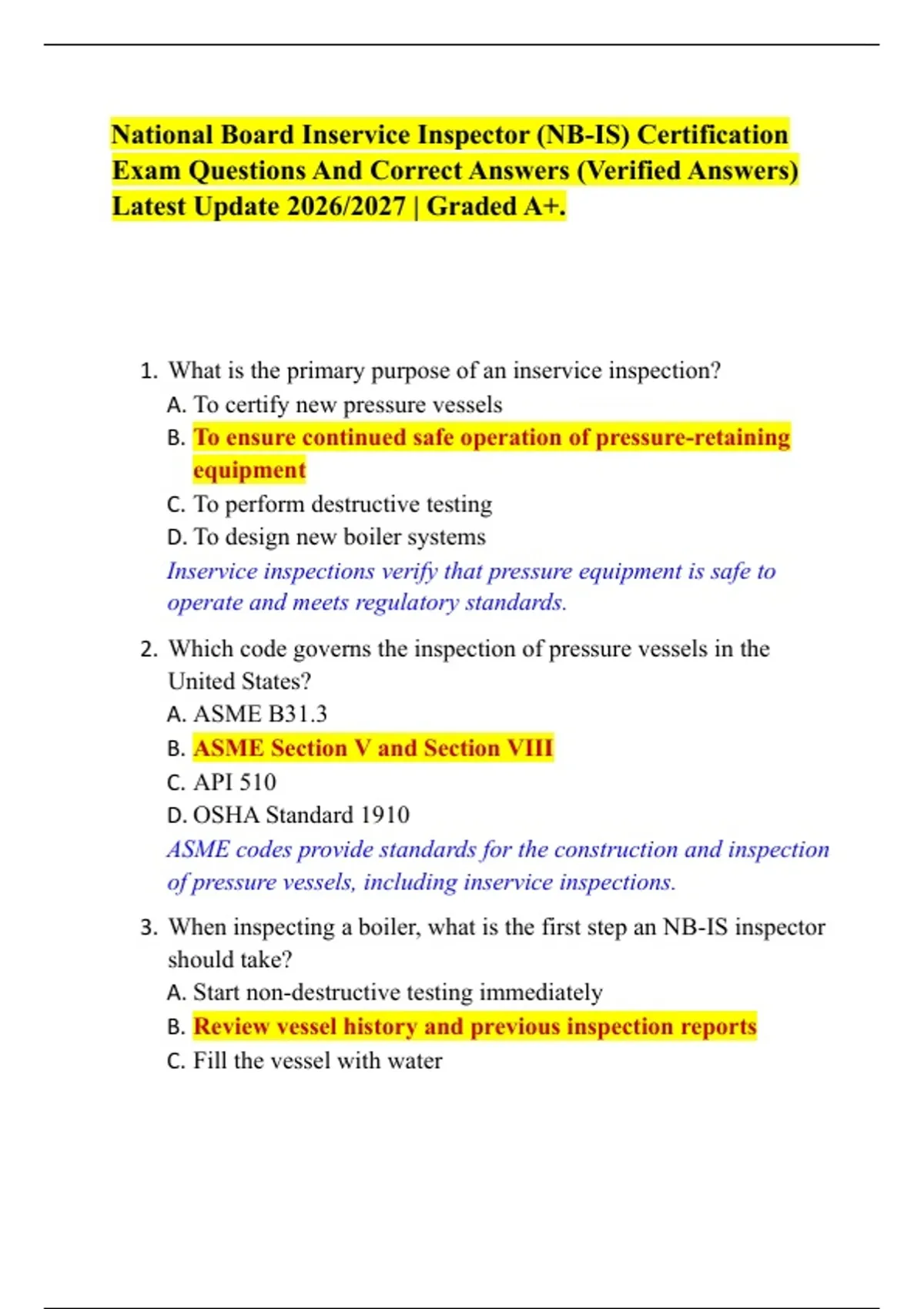National Board Inservice Inspector (NB-IS) Certification Exam Questions And Correct Answers (Verified Answers) Latest Update 2026/2027 | Graded A+. 1. What is the primary purpose of an inservice inspection? A. To certify new pressure vessels B. To ensure continued safe operation of pressure-retaining equipment C. To perform destructive testing D. To design new boiler systems Inservice inspections verify that pressure equipment is safe to operate and meets regulatory standards. 2. Which code governs the inspection of pressure vessels in the United States? A. ASME B31.3 B. ASME Section V and Section VIII C. API 510 D. OSHA Standard 1910 ASME codes provide standards for the construction and inspection of pressure vessels, including inservice inspections. 3. When inspecting a boiler, what is the first step an NB-IS inspector should take? A. Start non-destructive testing immediately B. Review vessel history and previous inspection reports C. Fill the vessel with water D. Measure wall thickness Understanding prior inspection findings and vessel history guides the current inspection process. 5. For a pressurized vessel, what is the minimum acceptable wall thickness determined by? A. Manufacturer’s original design only B. Inspector’s judgment C. ASME code formulas considering corrosion allowance and design pressure D. Vessel age Code formulas ensure the vessel maintains structural integrity under operating conditions. 6. What is the purpose of a hydrostatic test? A. To measure operating temperature B. To verify the pressure vessel can safely handle its design pressure C. To remove scale buildup D. To check valve functionality Hydrostatic testing subjects the vessel to pressures higher than normal operation to check for leaks or weakness. 7. How often should an inservice inspection typically occur for boilers? A. Every month B. Every week C. Annually or as prescribed by code D. Only when a problem arises Frequency of inspections is set to ensure ongoing safety without unnecessary downtime. 8. Which non-destructive testing method is commonly used to detect internal flaws? A. Visual inspection B. Hydrostatic testing C. Ultrasonic testing D. Painting the vessel Ultrasonic testing uses sound waves to detect internal defects without damaging the vessel. 4. Which type of inspection requires the inspector to check for corrosion, cracking, and deformation? A. Hydrostatic testing B. Radiographic testing C. External and internal visual inspection D. Ultrasonic testing Visual inspections are critical for identifying surface defects and signs of deterioration. 9. When evaluating a welded joint, what defect is most critical? A. Surface rust B. Paint peeling C. Cracking or lack of fusion D. Minor scratches Cracks or incomplete fusion compromise structural integrity and can lead to catastrophic failure. 10. What should be done if a pressure vessel is found with a defect exceeding allowable limits? A. Ignore it if it looks minor B. Schedule the next inspection sooner C. Repair or remove the vessel from service until corrected D. Reduce operating pressure Code compliance requires defective equipment to be repaired or taken out of service to prevent accidents. 11. Which material property is essential to know when evaluating a vessel for corrosion?