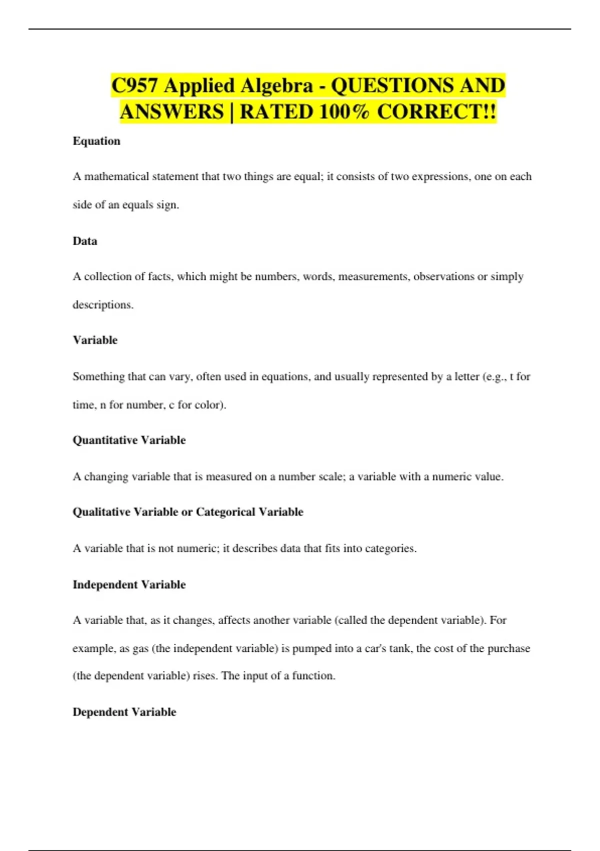 C957 Applied Algebra - QUESTIONS AND ANSWERS | RATED 100% CORRECT