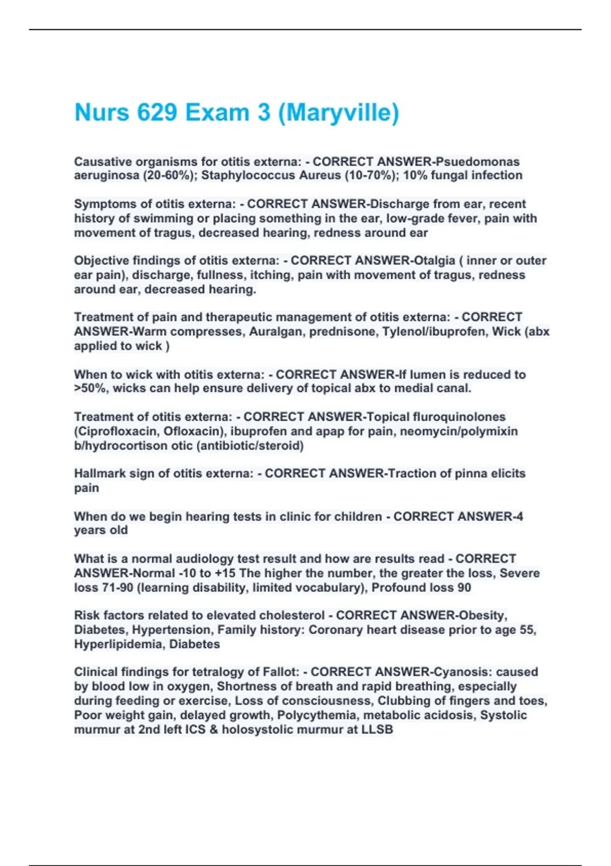 Causative organisms for otitis externa: - CORRECT ANSWER-Psuedomonas aeruginosa (20-60%); Staphylococcus Aureus (10-70%); 10% fungal infection Symptoms of otitis externa: - CORRECT ANSWER-Discharge from ear, recent history of swimming or placing something in the ear, low-grade fever, pain with movement of tragus, decreased hearing, redness around ear Objective findings of otitis externa: - CORRECT ANSWER-Otalgia ( inner or outer ear pain), discharge, fullness, itching, pain with movement of tragus, redness around ear, decreased hearing. Treatment of pain and therapeutic management of otitis externa: - CORRECT ANSWER-Warm compresses, Auralgan, prednisone, Tylenol/ibuprofen, Wick (abx applied to wick ) When to wick with otitis externa: - CORRECT ANSWER-If lumen is reduced to >50%, wicks can help ensure delivery of topical abx to medial canal. Treatment of otitis externa: - CORRECT ANSWER-Topical fluroquinolones (Ciprofloxacin, Ofloxacin), ibuprofen and apap for pain, neomycin/polymixin b/hydrocortison otic (antibiotic/steroid) Hallmark sign of otitis externa: - CORRECT ANSWER-Traction of pinna elicits pain When do we begin hearing tests in clinic for children - CORRECT ANSWER-4 years old What is a normal audiology test result and how are results read - CORRECT ANSWER-Normal -10 to +15 The higher the number, the greater the loss, Severe loss 71-90 (learning disability, limited vocabulary), Profound loss 90 Risk factors related to elevated cholesterol - CORRECT ANSWER-Obesity, Diabetes, Hypertension, Family history: Coronary heart disease prior to age 55, Hyperlipidemia, Diabetes Clinical findings for tetralogy of Fallot: - CORRECT ANSWER-Cyanosis: caused by blood low in oxygen, Shortness of breath and rapid breathing, especially during feeding or exercise, Loss of consciousness, Clubbing of fingers and toes, Poor weight gain, delayed growth, Polycythemia, metabolic acidosis, Systolic murmur at 2nd left ICS & holosystolic murmur at LLSBWhat criteria would you have to consider inpatient admission in a patient with pneumonia - CORRECT ANSWER-Infants less than 4 months old, Infant with poor feeding, grunting, O2 saturation <92%, respiratory rate >70 , Older child with grunting, inability to tolerate oral intake, oxygen saturation ≤ 92 percent, respiratory rate > 50 breaths per minute, Any age: Comorbidities (e.g., chronic lung disease, asthma, unrepaired or incompletely repaired congenital heart disease, diabetes mellitus, neuromuscular disease)