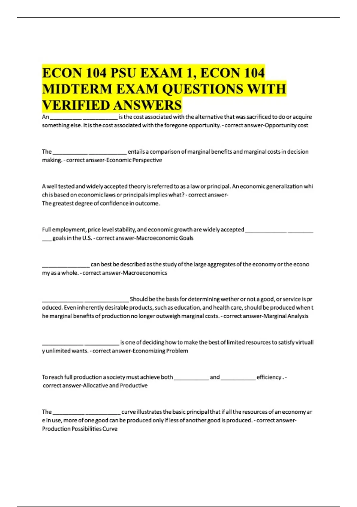 ECON 104 PSU EXAM 1, ECON 104 MIDTERM EXAM QUESTIONS WITH VERIFIED ANSWERS.