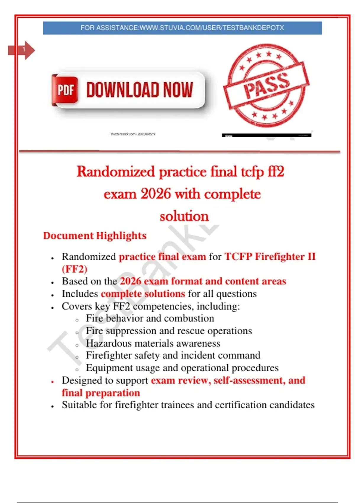 This document provides a randomized practice final exam for the TCFP Firefighter II (FF2) certification, aligned with the 2026 exam format. It includes comprehensive practice questions with complete solutions, covering essential FF2 topics such as fire behavior, suppression operations, rescue procedures, hazardous materials awareness, firefighter safety, and equipment usage.
