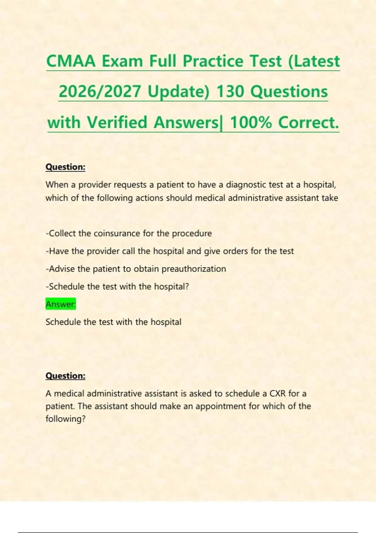 CMAA Exam Full Practice Test (Latest 2026/2027 Update) 130 Questions with Verified Answers| 100% Correct. CMAA Exam Full Practice Test (Latest 2026/2027 Update) 130 Questions with Verified Answers| 100% Correct. CMAA Exam Full Practice Test (Latest 2026/2027 Update) 130 Questions with Verified Answers| 100% Correct.