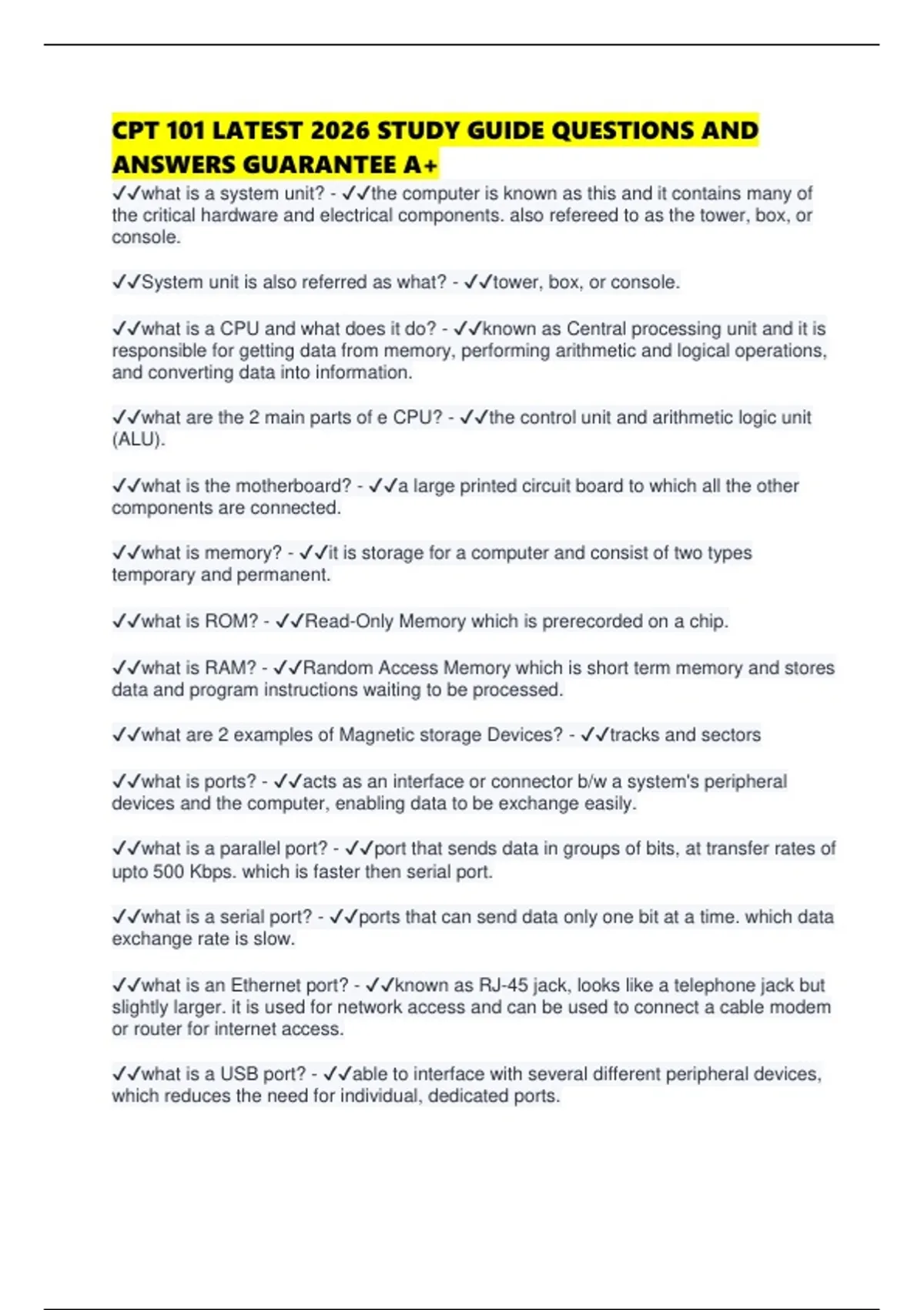 CPT 101 LATEST 2026 STUDY GUIDE QUESTIONS AND ANSWERS GUARANTEE A+
