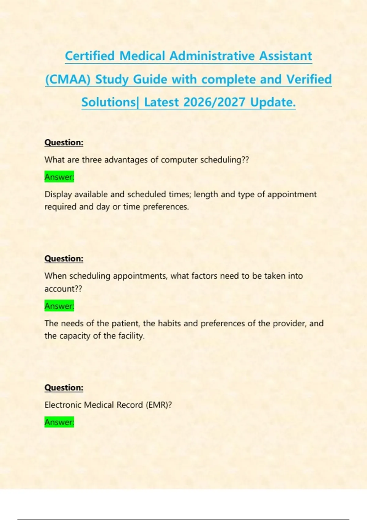 Certified Medical Administrative Assistant (CMAA) Study Guide with complete and Verified Solutions| Latest 2026/2027 Update. Certified Medical Administrative Assistant (CMAA) Study Guide with complete and Verified Solutions| Latest 2026/2027 Update.