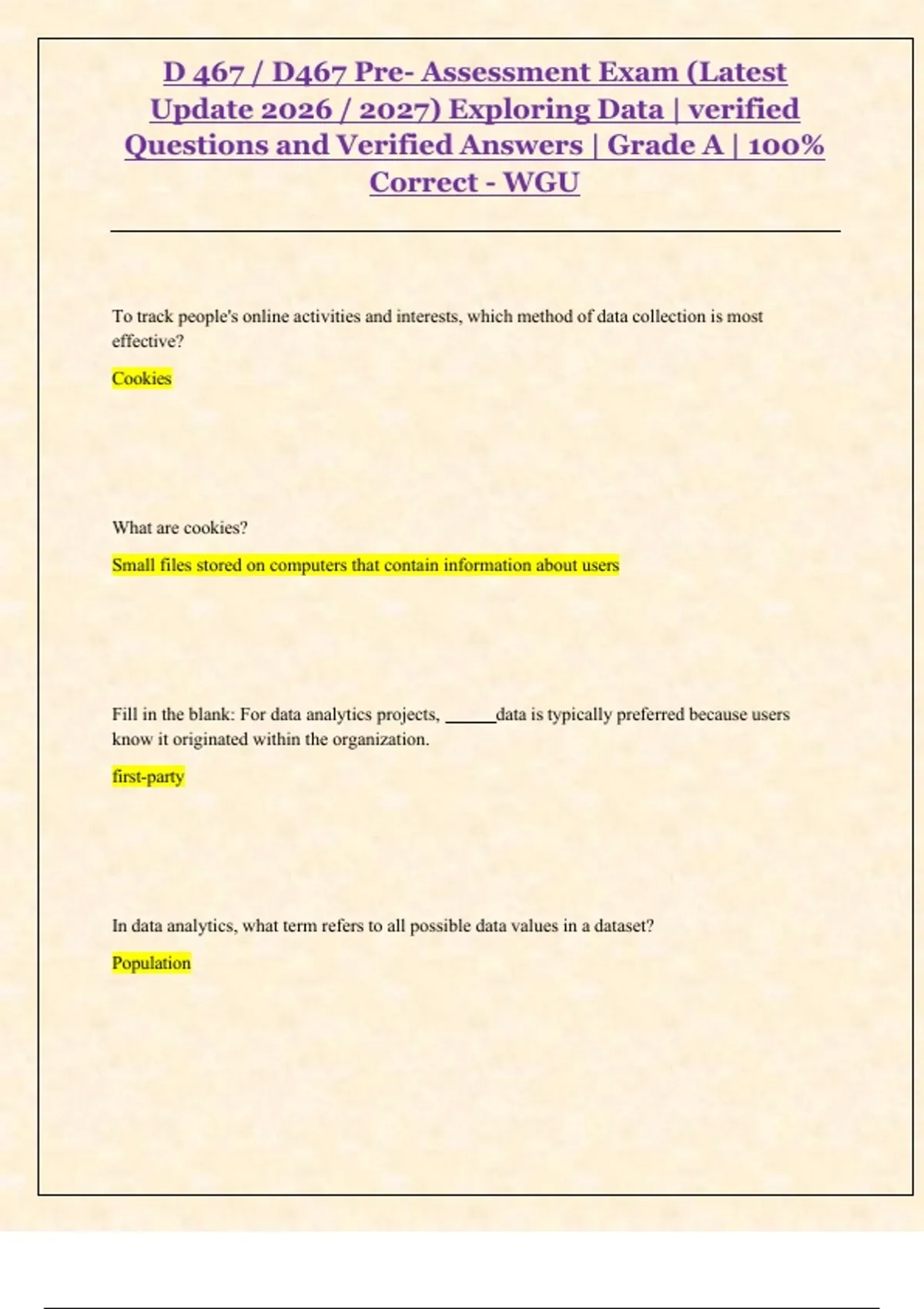 D 467 / D467 Pre- Assessment Exam (Latest Update 2026 / 2027) Exploring Data | verified Questions and Verified Answers | Grade A | 100% Correct - WGU