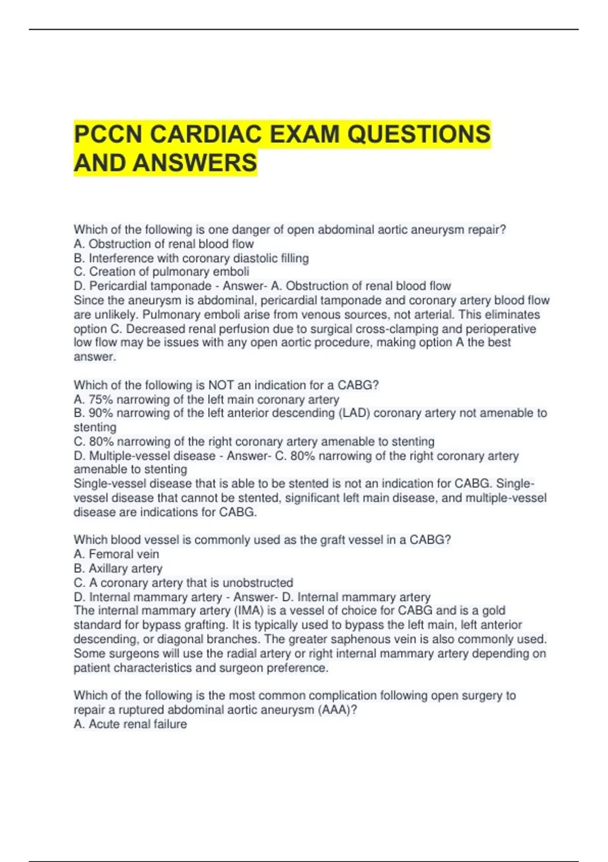 PCCN CARDIAC EXAM QUESTIONS AND ANSWERS