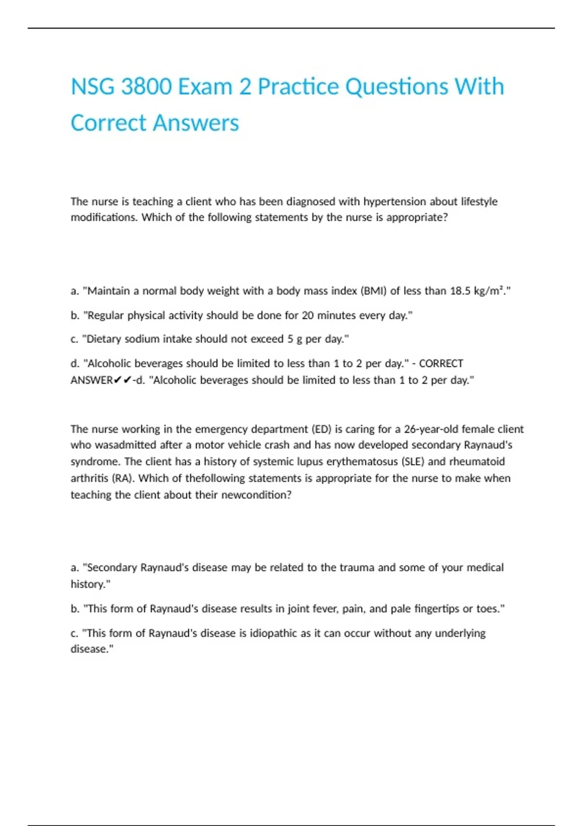 NSG 3800 Exam 2 Practice Questions With Correct Answers