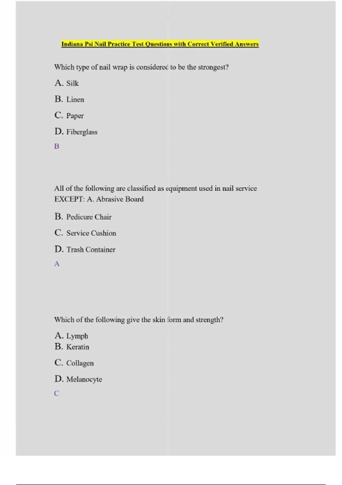 Indiana Psi Nail Practice Test Questions with Correct Verified Answers Indiana Psi Nail Practice Test Questions with Correct Verified Answers