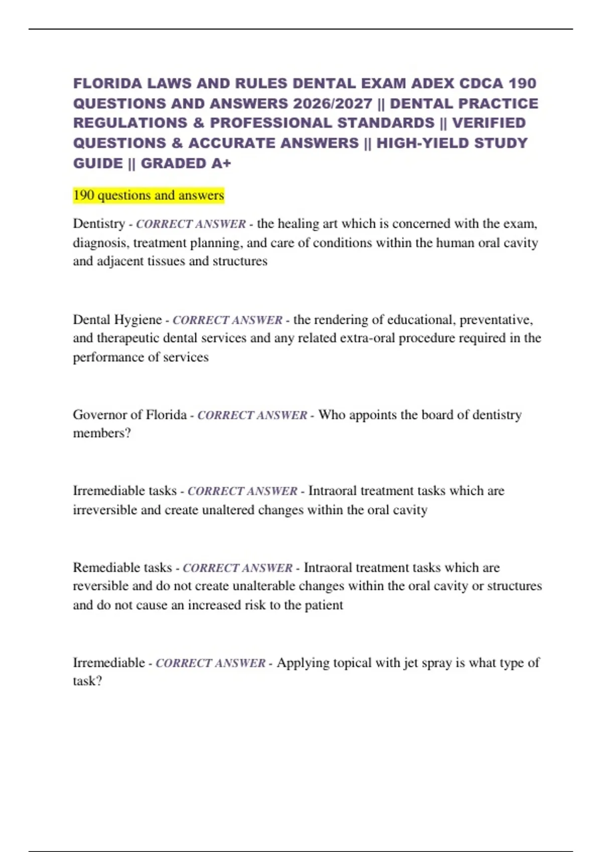 FLORIDA LAWS AND RULES DENTAL EXAM ADEX CDCA 190 QUESTIONS AND ANSWERS 2026/2027 || DENTAL PRACTICE REGULATIONS & PROFESSIONAL STANDARDS || VERIFIED QUESTIONS & ACCURATE ANSWERS || HIGH-YIELD STUDY GUIDE || GRADED A+