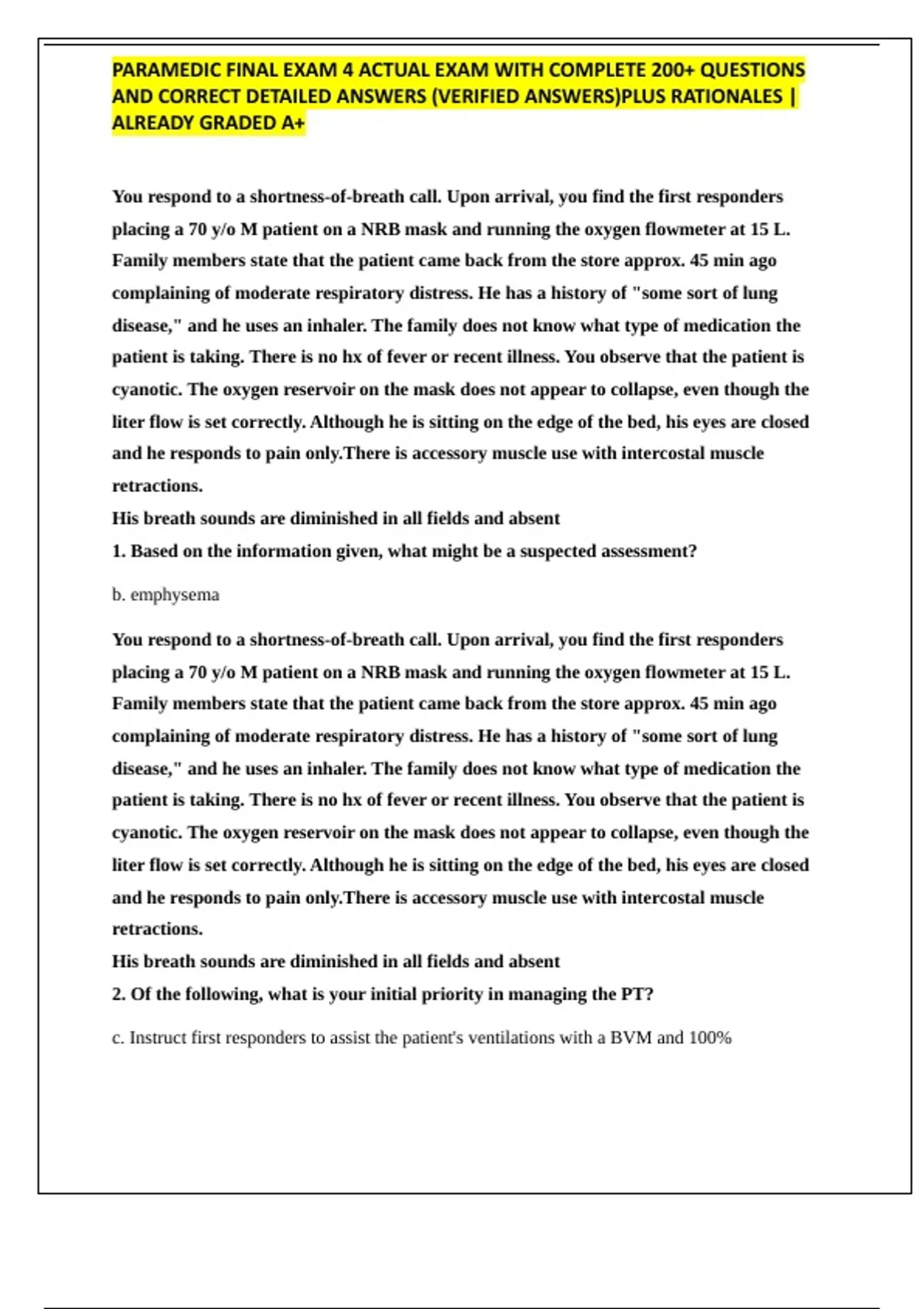 PARAMEDIC FINAL EXAM 4 ACTUAL EXAM WITH COMPLETE 200+ QUESTIONS AND CORRECT DETAILED ANSWERS (VERIFIED ANSWERS)PLUS RATIONALES |ALREADY GRADED A+