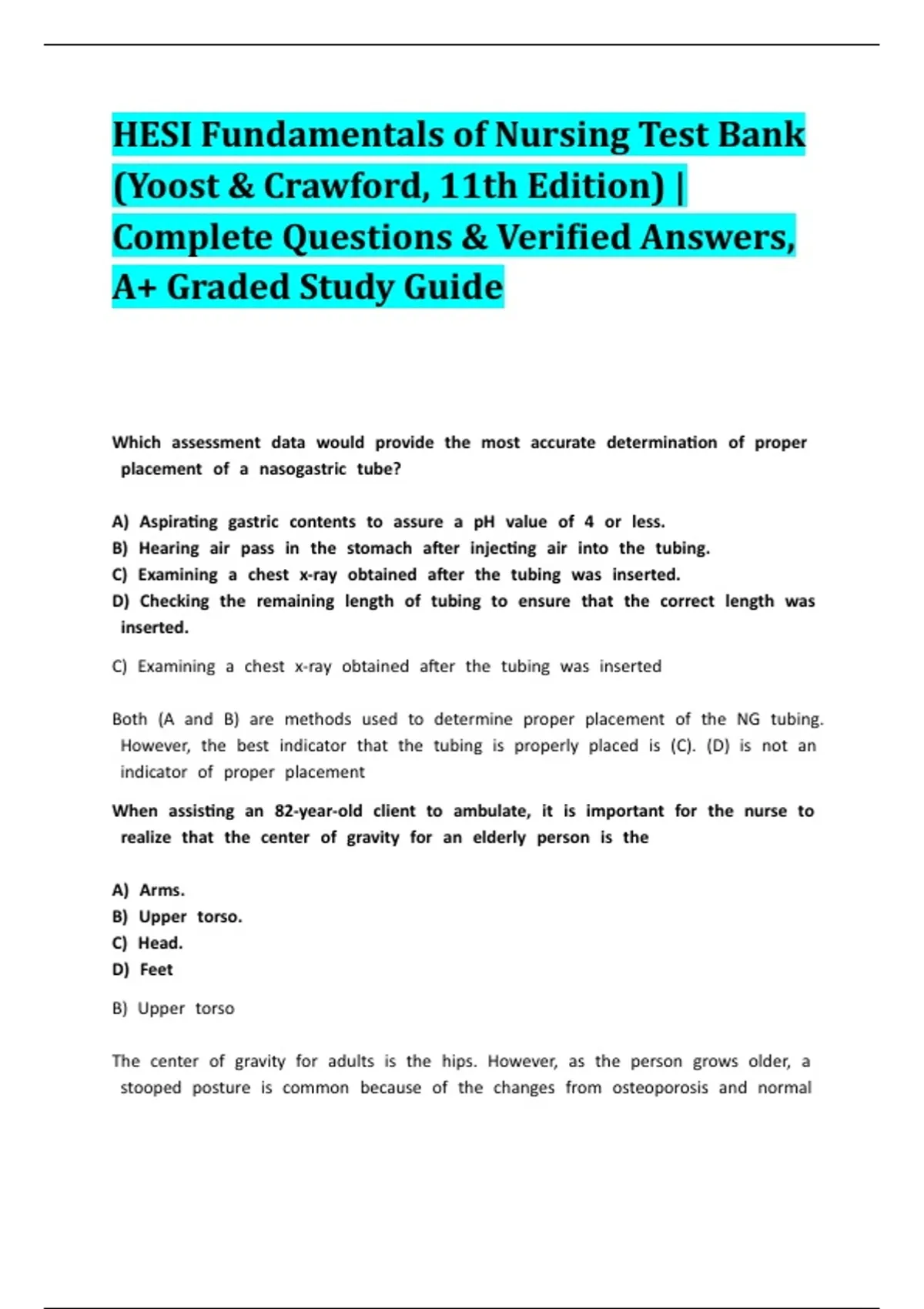 Ace your HESI Fundamentals of Nursing exam with this comprehensive Test Bank and Study Guide, perfectly aligned with the Yoost & Crawford 11th Edition textbook. This complete resource provides hundreds of practice questions covering all critical areas of nursing fundamentals, complete with verified, rationalized answers for an A+ grade. It’s an essential study tool for nursing students preparing for course exams, the HESI exit exam, or the NCLEX-RN. What’s Inside: Hundreds of Practice Questions: Multiple-choice questions mirroring the format and difficulty of the actual HESI exam. Verified Answers & Detailed Rationales: Every answer includes a clear explanation, helping you understand the why behind correct and incorrect choices. Comprehensive Coverage: All key topics from the Yoost & Crawford 11th Edition, including: Nursing Process & Critical Thinking Patient Safety, Infection Control & Asepsis Medication & IV Calculation (with step-by-step math solutions) Vital Signs & Health Assessment Culture, Spirituality, & Patient Education Fluid & Electrolytes, Nutrition Perioperative & Wound Care Elimination, Oxygenation, & Rest/Comfort Legal/Ethical Issues & Professional Practice Proven Study Aid: Used by thousands of nursing students to boost confidence, identify knowledge gaps, and achieve top scores. Ideal For: Nursing students in Fundamentals of Nursing courses Anyone using the Yoost & Crawford Fundamentals of Nursing (11th Edition) textbook Students preparing for the HESI Fundamentals exit exam NCLEX-RN candidates seeking foundational practice Download now and get the ultimate edge for your nursing fundamentals exam!