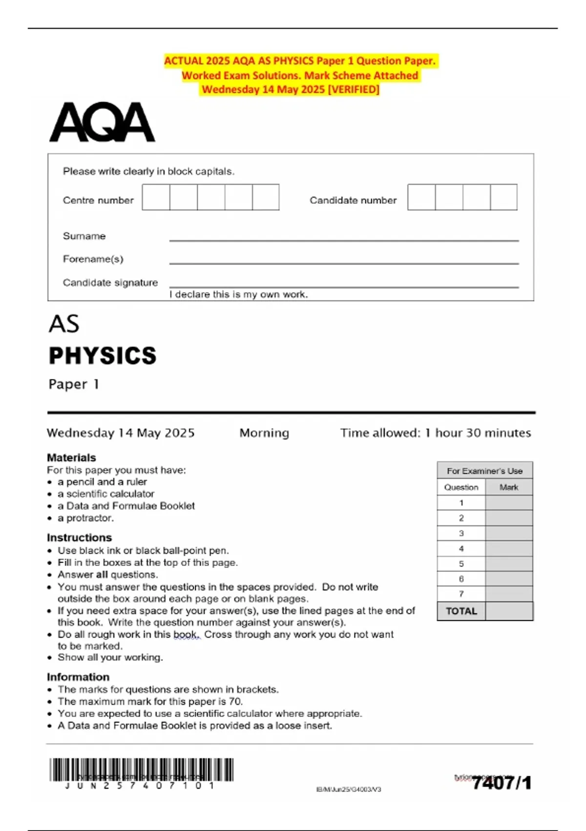 ACTUAL 2025 AQA AS PHYSICS Paper 1 Question Paper.