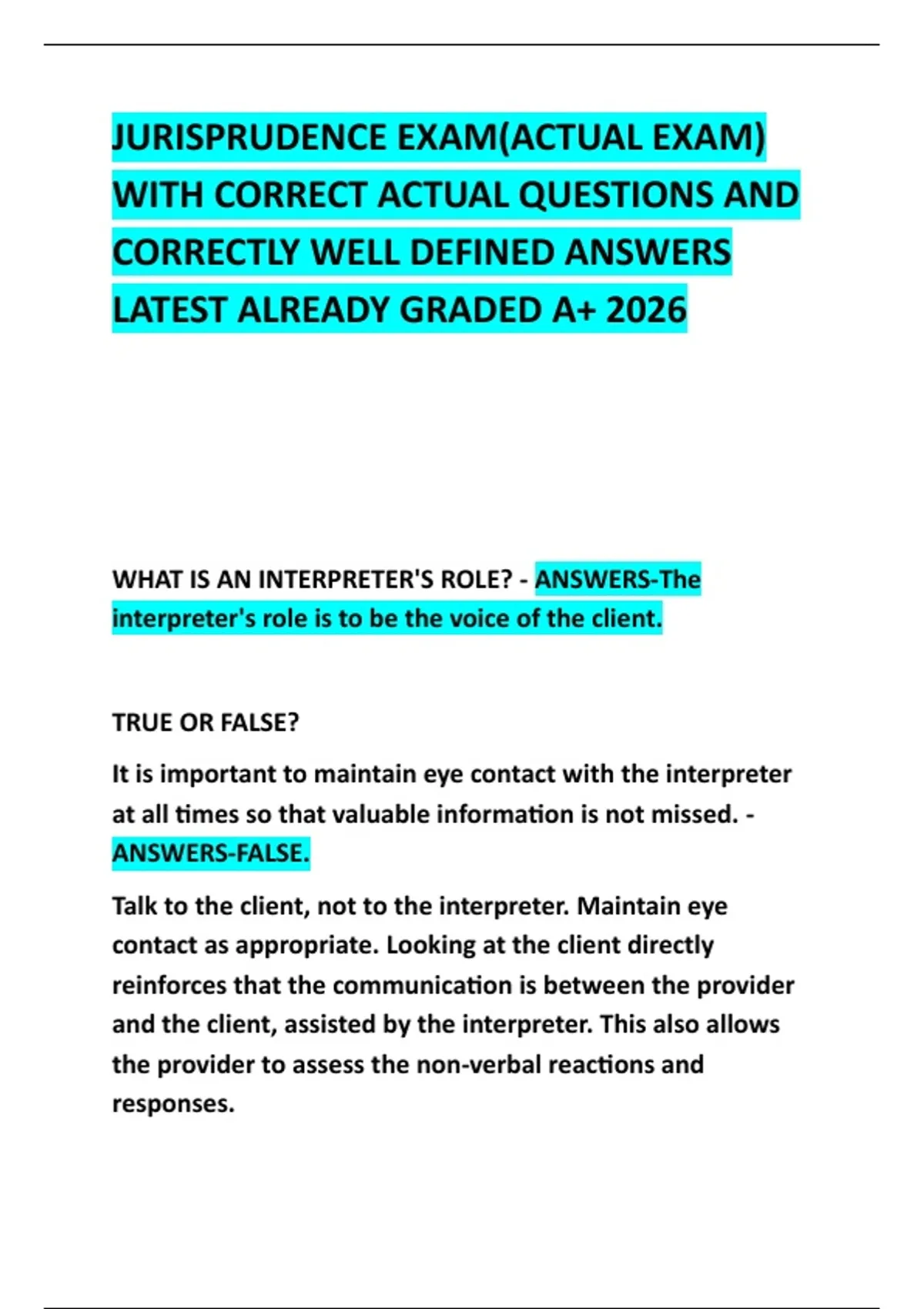 JURISPRUDENCE EXAM(ACTUAL EXAM) WITH CORRECT ACTUAL QUESTIONS AND CORRECTLY WELL DEFINED ANSWERS LATEST ALREADY GRADED A+ 2026