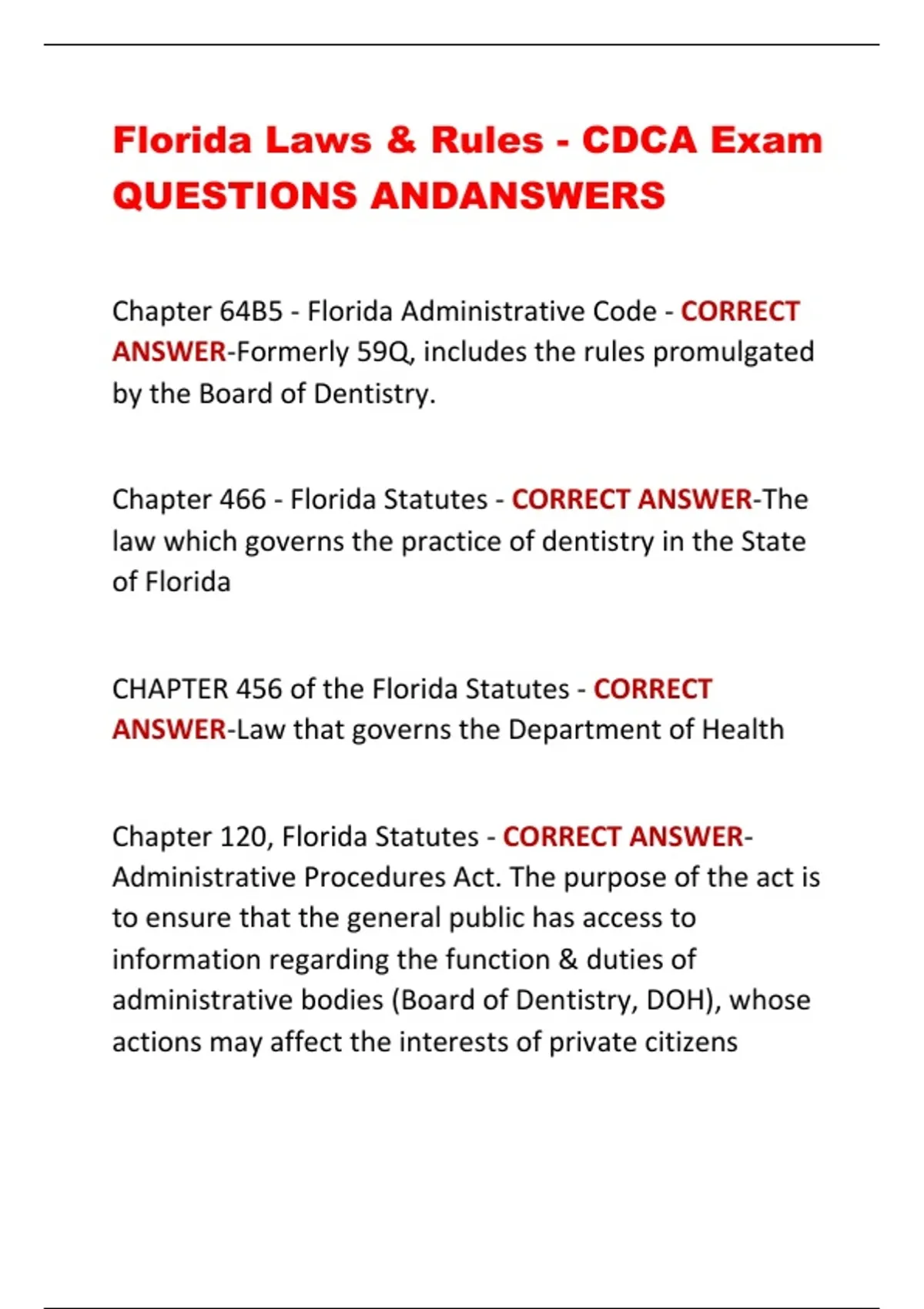 Florida Laws & Rules - CDCA Exam QUESTIONS ANDANSWERS