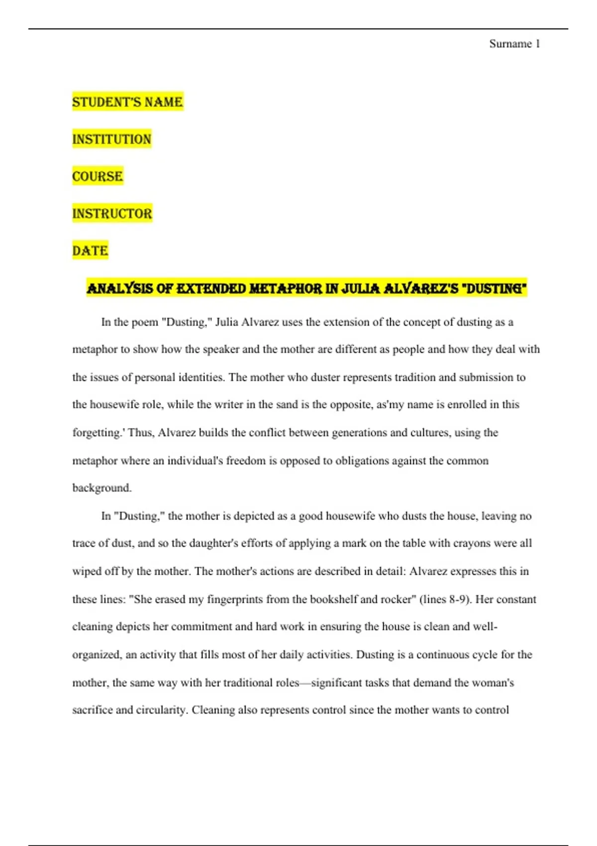 Analysis of Extended Metaphor in Julia Alvarez's "Dusting"