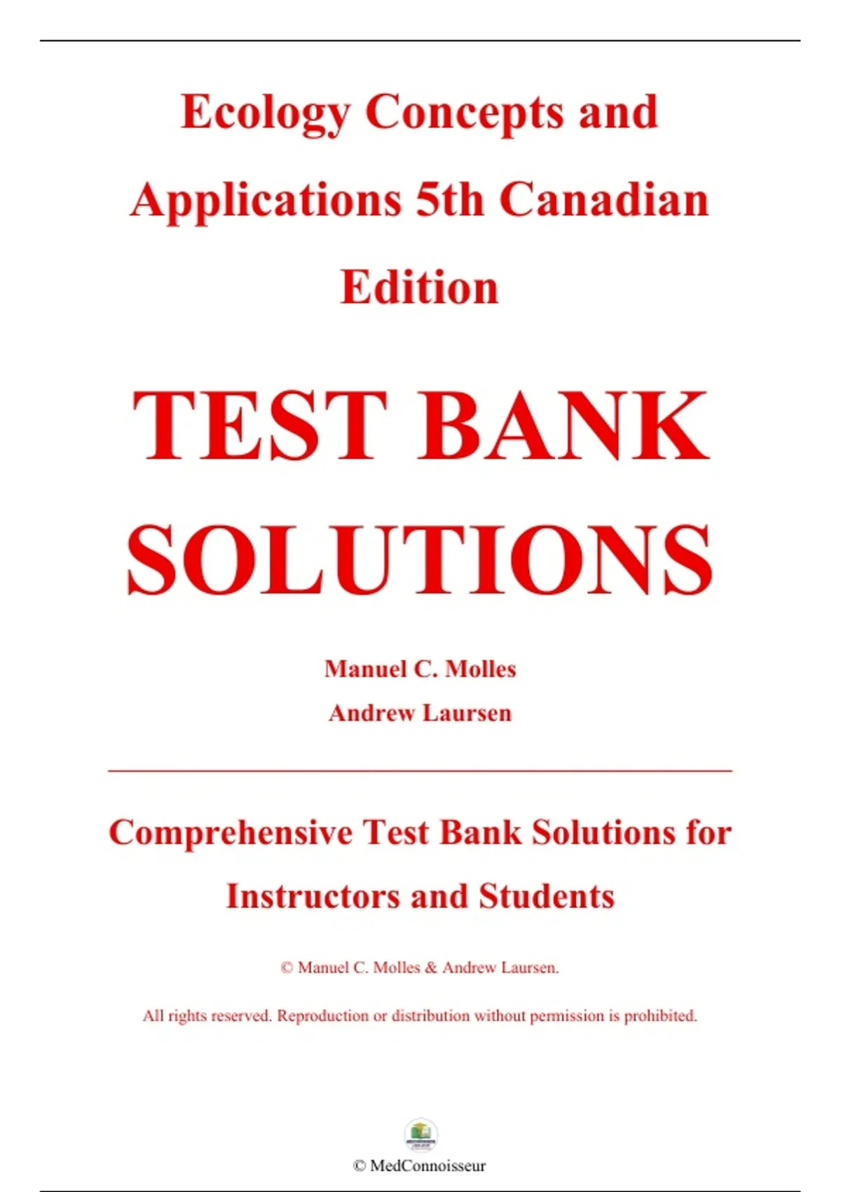 Accredited Test Bank Solutions — Ecology: Concepts and Applications, 5th Canadian Edition — Michael C. Molles Jr. — (All Chapters Covered 1–22, Questions & Answers). Covered chapters include: Chapter 1 Introduction to Ecology: Historical Foundations and Developing Frontiers, Chapter 2 Life on Land, Chapter 3 Life in Water, Chapter 4 Population Genetics and Natural Selection, Chapter 5 Temperature Relations, Chapter 6 Water Relations, Chapter 7 Energy and Nutrient Relations, Chapter 8 Social Relations, Chapter 9 Population Distribution and Abundance, Chapter 10 Population Dynamics, Chapter 11 Population Growth, Chapter 12 Life Histories, Chapter 13 Competition, Chapter 14 Exploitation: Predation, Herbivory, Parasitism, and Disease, Chapter 15 Mutualism, Chapter 16 Species Abundance and Diversity, Chapter 17 Primary Production and Energy Flow, Chapter 18 Nutrient Cycling and Retention, Chapter 19 Succession and Stability, Chapter 20 Landscape Ecology, Chapter 21 Geographic Ecology, Chapter 22 Global Ecology.