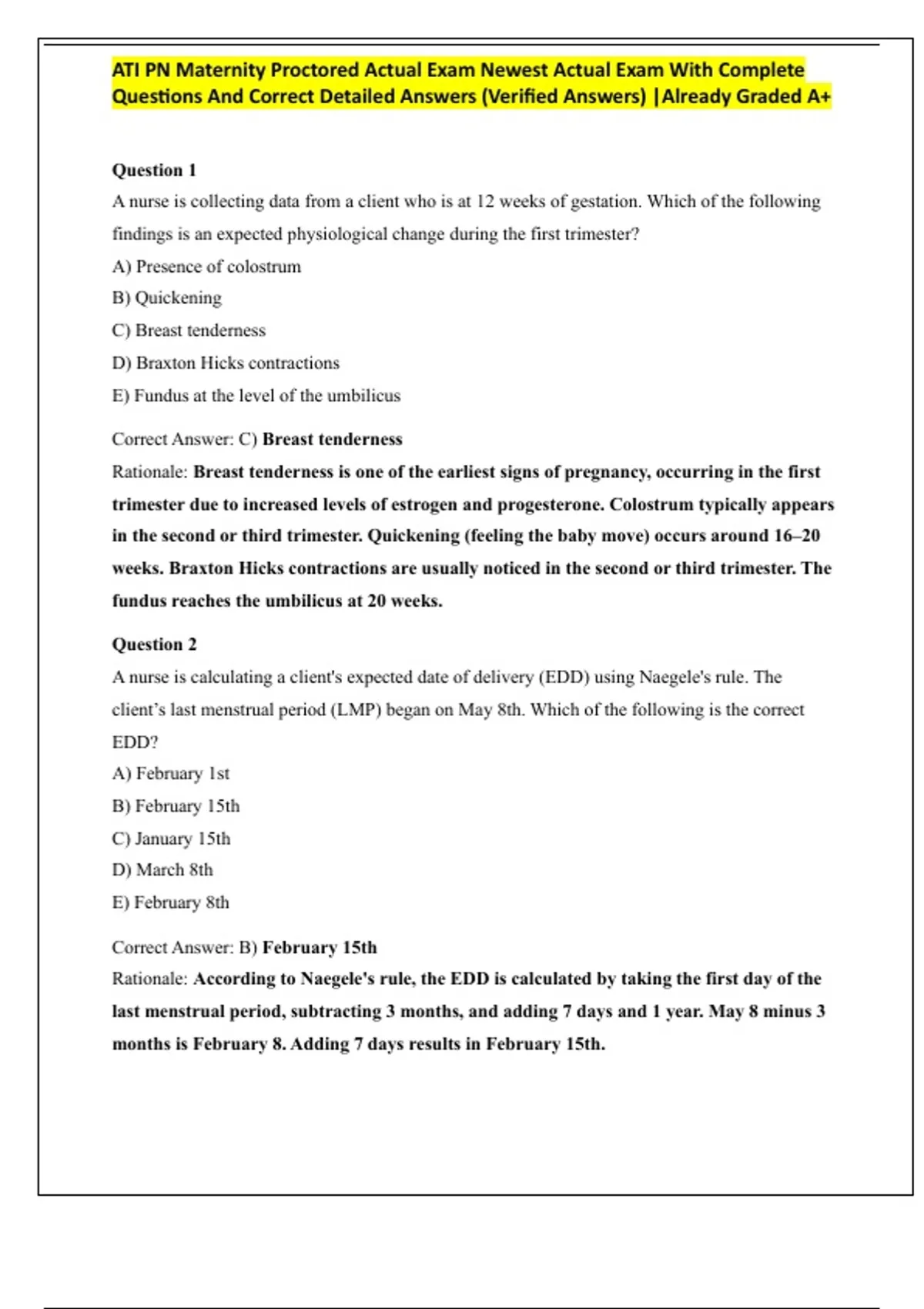 ATI PN Maternity Proctored Actual Exam Newest Actual Exam With Complete