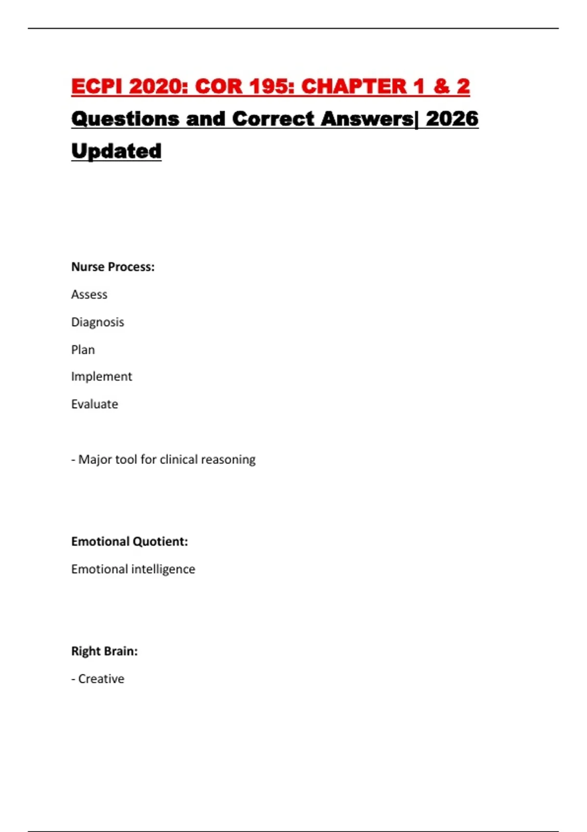 This document covers Chapters 1 and 2 of the COR 195 course at ECPI University, focusing on critical thinking in nursing practice. It includes clearly structured questions and correct answers addressing the nursing process, clinical reasoning, clinical judgment, emotional intelligence, problem-solving, and reflective thinking. The content is updated for 2026 and supports exam preparation, concept clarification, and practical application in clinical settings.