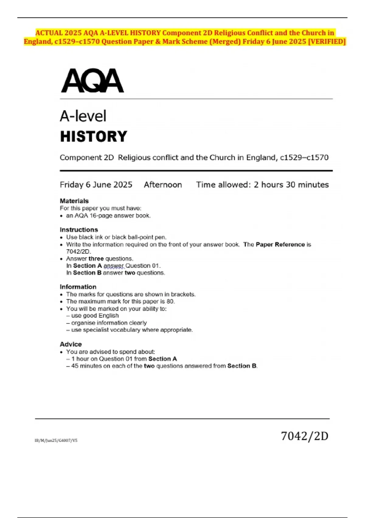 England, c1529–c1570 Question Paper & Mark Scheme (Merged) Friday 6 June 2025 [VERIFIED]