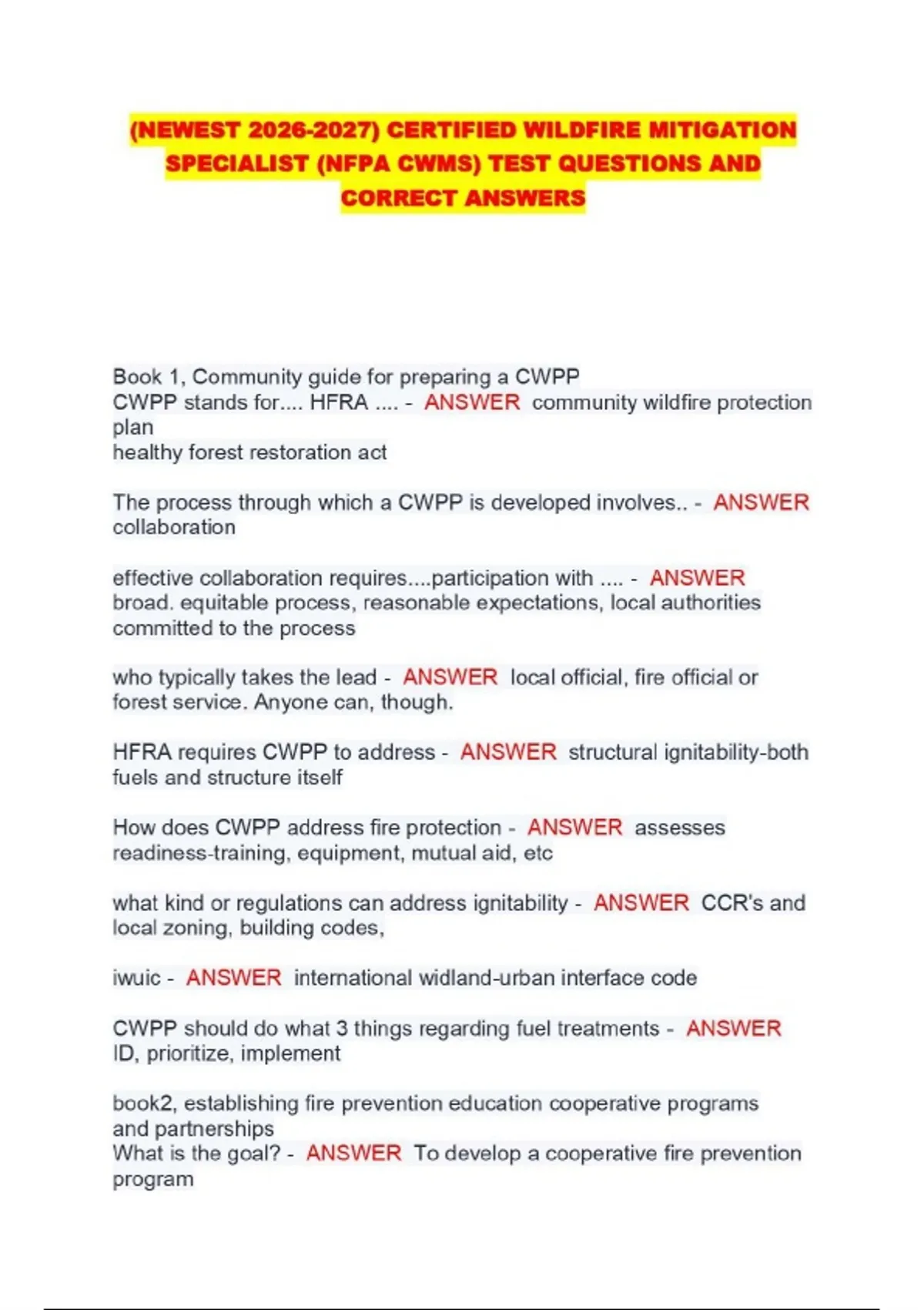 (NEWEST ) CERTIFIED WILDFIRE MITIGATION SPECIALIST (NFPA CWMS) TEST QUESTIONS AND CORRECT ANSWERS