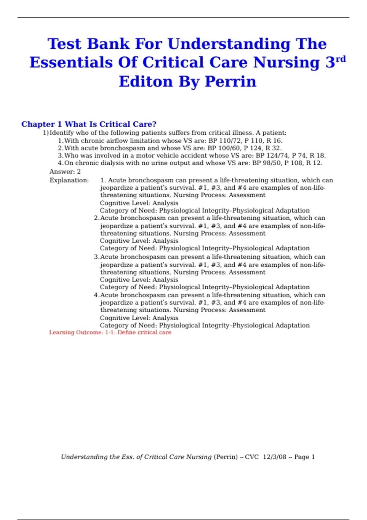 Test Bank For Understanding The Essentials Of Critical Care Nursing 3rd Editon By Perrin 100% Verified Questions & Answers Graded A+ Guaranteed Pass