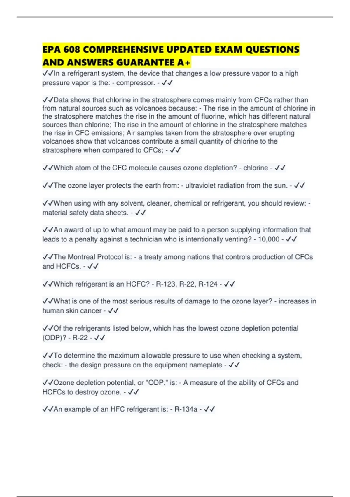 EPA 608 COMPREHENSIVE UPDATED EXAM QUESTIONS AND ANSWERS GUARANTEE A+
