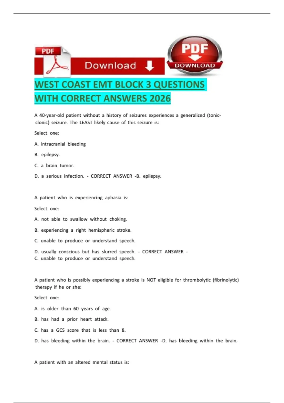 WEST COAST EMT BLOCK 3 QUESTIONS WITH CORRECT ANSWERS 2026