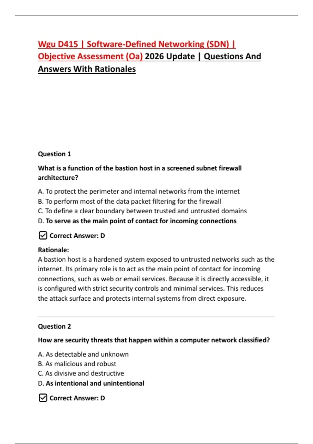 This document covers the full WGU D415 Software-Defined Networking (SDN) Objective Assessment, including exam-style multiple-choice questions with correct answers and clear rationales. It addresses core SDN concepts such as control and data planes, OpenFlow, controllers, security, OpenStack components, and enterprise/cloud use cases. The material is organized for efficient exam preparation and aligned with the 2026 OA update, making it suitable as complete exam review material.